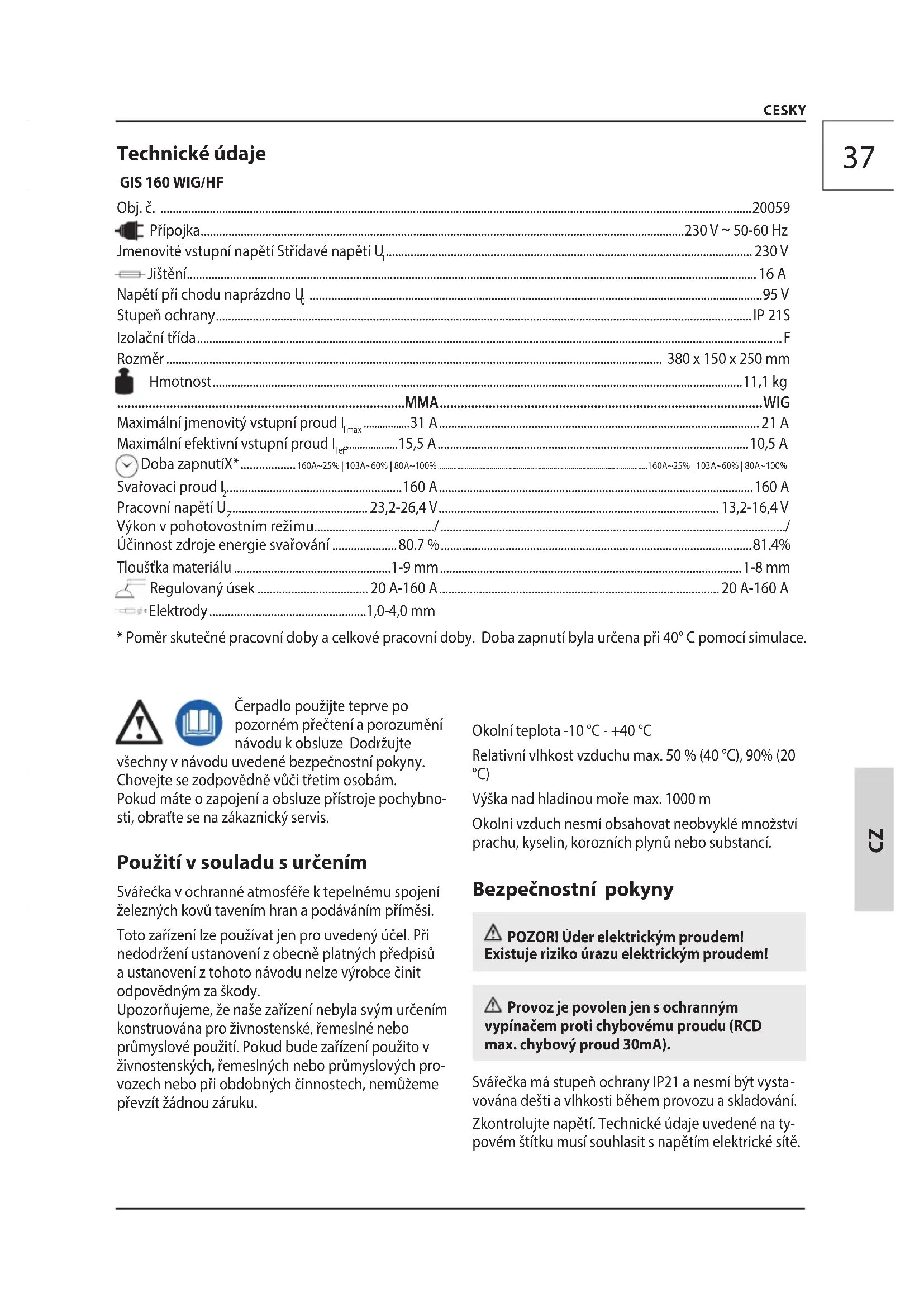 povém štítku musí souhlasit s napětím elektrické sítě. Čerpadlo použijte teprve po pozorném přečtení a porozumění návodu k obsluze Dodržujte všechny v návodu uvedené bezpečnostní pokyny. Chovejte se zodpovědně vůči třetím osobám. Pokud máte o zapojení a obsluze přístroje pochybno- sti, obraťte se na zákaznický servis. Použití v souladu s určením Svářečka v ochranné atmosféře k tepelnému spojení železných kovů tavením hran a podáváním příměsi. Toto zařízení lze používat jen pro uvedený účel. Při nedodržení ustanovení z obecně platných předpisů a ustanovení z tohoto návodu nelze výrobce činit odpovědným za škody. Upozorňujeme, že naše zařízení nebyla svým určením konstruována pro živnostenské, řemeslné nebo průmyslové použití. Pokud bude zařízení použito v živnostenských, řemeslných nebo průmyslových pro- vozech nebo při obdobných činnostech, nemůžeme převzít žádnou záruku. CESKY Technické údaje