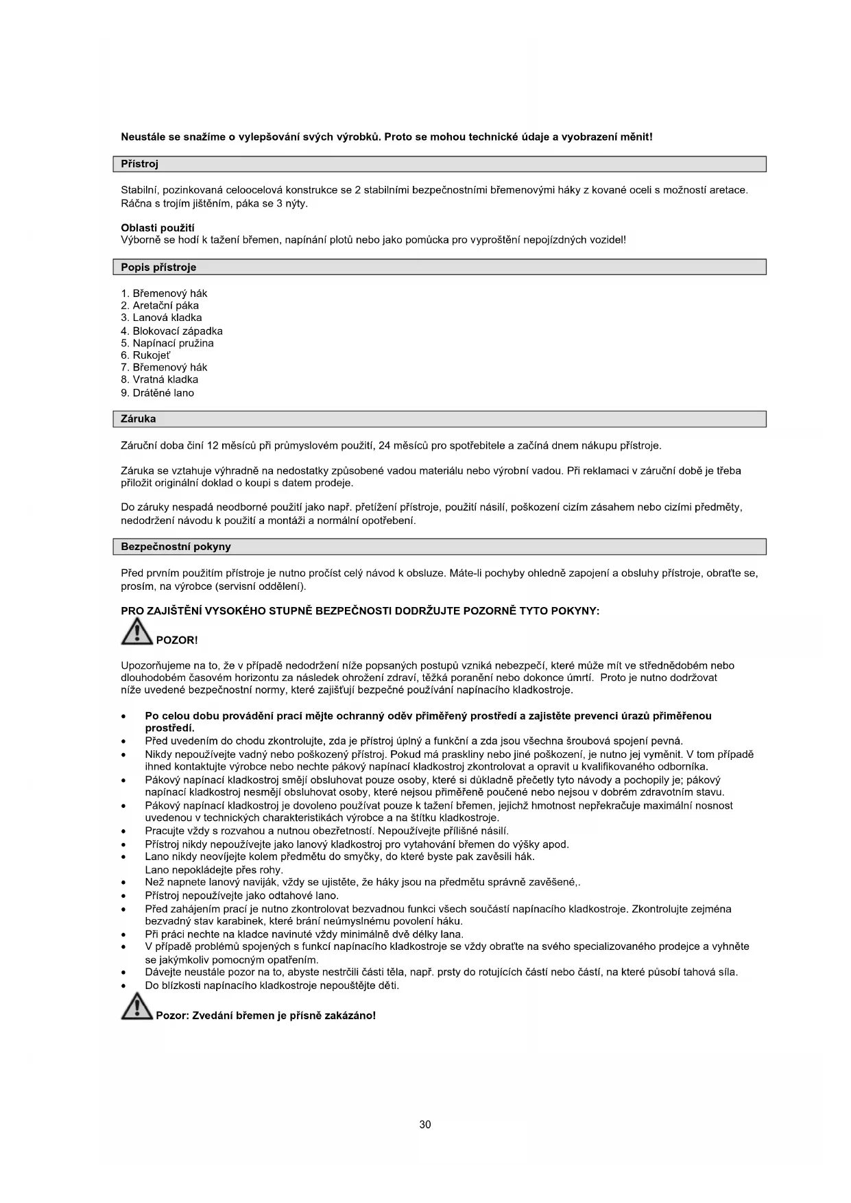 Záruka Záruþní doba þiní 12 mČsícĤ pĜi prĤmyslovém použití, 24 mČsícĤ pro spotĜebitele a zaþíná dnem nákupu pĜístroje. Záruka se vztahuje výhradnČ na nedostatky zpĤsobené vadou materiálu nebo výrobní vadou. PĜi reklamaci v záruþní dobČ je tĜeba pĜiložit originální doklad o koupi s datem prodeje. Do záruky nespadá neodborné použití jako napĜ. pĜetížení pĜístroje, použití násilí, poškození cizím zásahem nebo cizími pĜedmČty, nedodržení návodu k použití a montáži a normální opotĜebení. Bezpeþnostní pokyny PĜed prvním použitím pĜístroje je nutno proþíst celý návod k obsluze. Máte-li pochyby ohlednČ zapojení a obsluhy pĜístroje, obraĢte se, prosím, na výrobce (servisní oddČlení). PRO ZAJIŠTċNÍ VYSOKÉHO STUPNċ BEZPEýNOSTI DODRŽUJTE POZORNċ TYTO POKYNY: POZOR! UpozorĖujeme na to, že v pĜípadČ nedodržení níže popsaných postupĤ vzniká nebezpeþí, které mĤže mít ve stĜednČdobém nebo dlouhodobém þasovém horizontu za následek ohrožení zdraví, tČžká poranČní nebo dokonce úmrtí. Proto je nutno dodržovat níže uvedené bezpeþnostní normy, které zajišĢují bezpeþné používání napínacího kladkostroje. x Po celou dobu provádČní prací mČjte ochranný odČv pĜimČĜený prostĜedí a zajistČte prevenci úrazĤ pĜimČĜenou prostĜedí. x PĜed uvedením do chodu zkontrolujte, zda je pĜístroj úplný a funkþní a zda jsou všechna šroubová spojení pevná. x Nikdy nepoužívejte vadný nebo poškozený pĜístroj. Pokud má praskliny nebo jiné poškození, je nutno jej vymČnit. V tom pĜípadČ ihned kontaktujte výrobce nebo nechte pákový napínací kladkostroj zkontrolovat a opravit u kvalifikovaného odborníka. x Pákový napínací kladkostroj smČjí obsluhovat pouze osoby, které si dĤkladnČ pĜeþetly tyto návody a pochopily je; pákový napínací kladkostroj nesmČjí obsluhovat osoby, které nejsou pĜimČĜenČ pouþené
