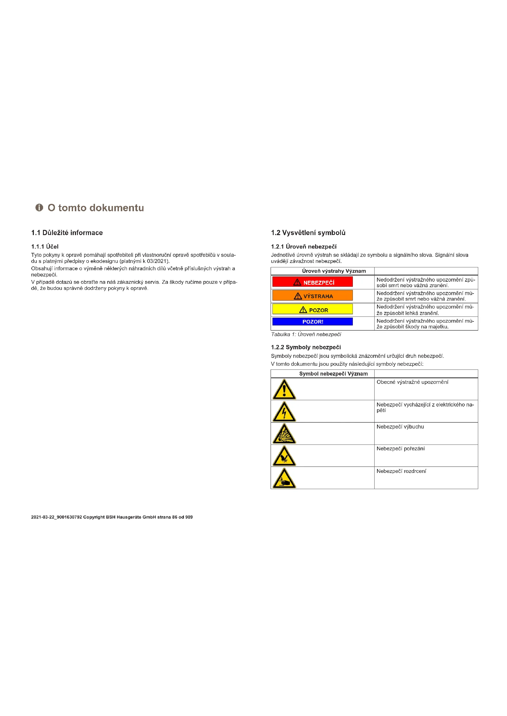 Symboly nebezpečí jsou symbolická znázornění určující druh nebezpečí. V tomto dokumentu jsou použity následující symboly nebezpečí: Symbol nebezpečí Význam Obecné výstražné upozornění Nebezpečí vycházející z elektrického na- pětí Nebezpečí výbuchu Nebezpečí pořezání Nebezpečí rozdrcení O tomto dokumentu 2021-03-22_9001630792 Copyright BSH Hausgeräte GmbH strana86od989Symbol nebezpečí Význam Nebezpečí spojené s horkými povrchy Nebezpečí vycházející ze silného elektro- magnetického pole Nebezpečí z neionizujícího záření Tabulka2: Symboly nebezpečí