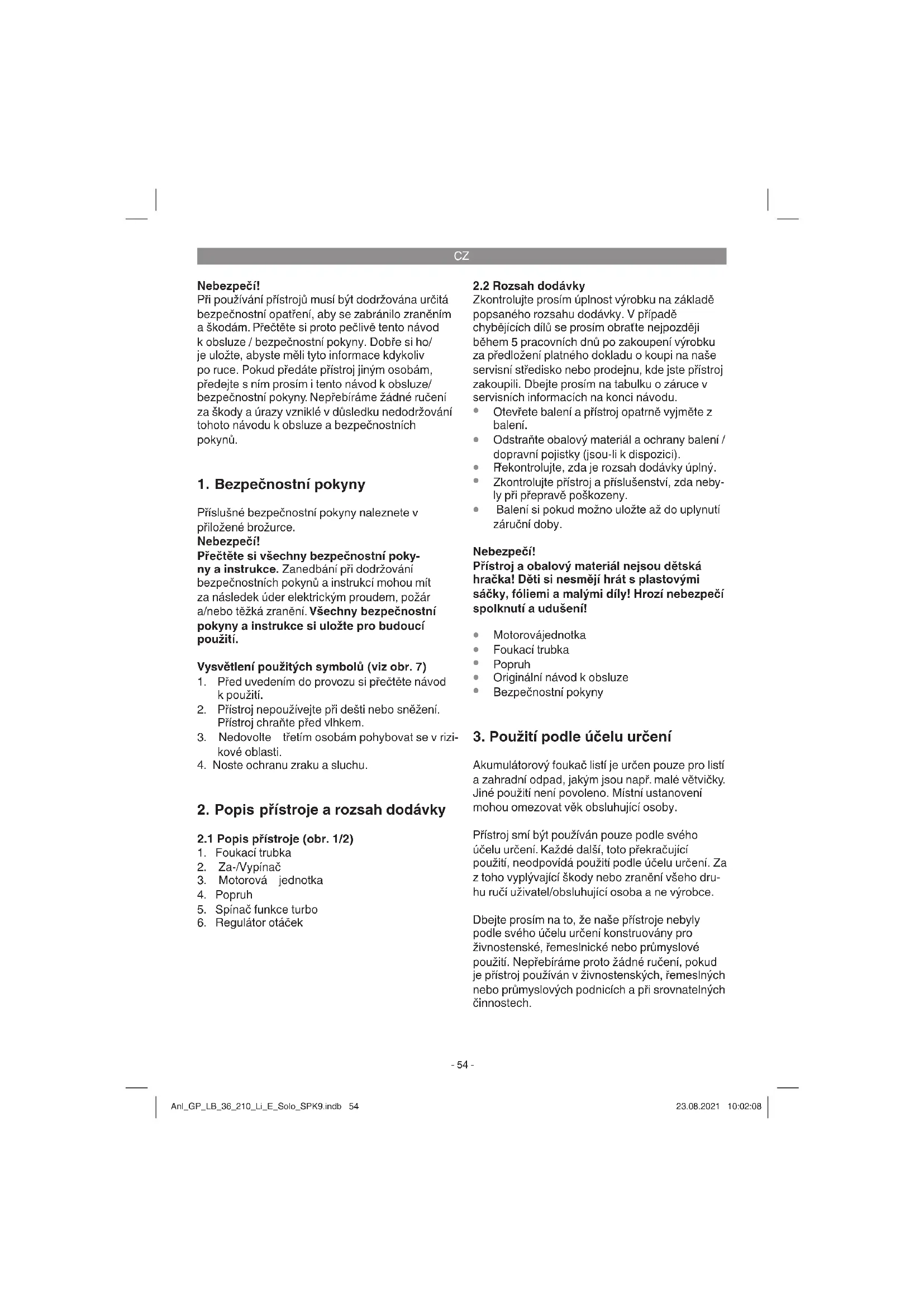 Akumulátorový foukač listí je určen pouze pro listí a zahradní odpad, jakým jsou např. malé větvičky. Jiné použití není povoleno. Místní ustanovení mohou omezovat věk obsluhující osoby. Přístroj smí být používán pouze podle svého účelu určení. Každé další, toto překračující použití, neodpovídá použití podle účelu určení. Za z toho vyplývající škody nebo zranění všeho dru- hu ručí uživatel/obsluhující osoba a ne výrobce. Dbejte prosím na to, že naše přístroje nebyly podle svého účelu určení konstruovány pro živnostenské, řemeslnické nebo průmyslové použití. Nepřebíráme proto žádné ručení, pokud je přístroj používán v živnostenských, řemeslných nebo průmyslových podnicích a při srovnatelných činnostech. Anl_GP_LB_36_210_Li_E_Solo_SPK9.indb 54Anl_GP_LB_36_210_Li_E_Solo_SPK9.indb 54 23.08.2021 10:02:0823.08.2021 10:02:08CZ