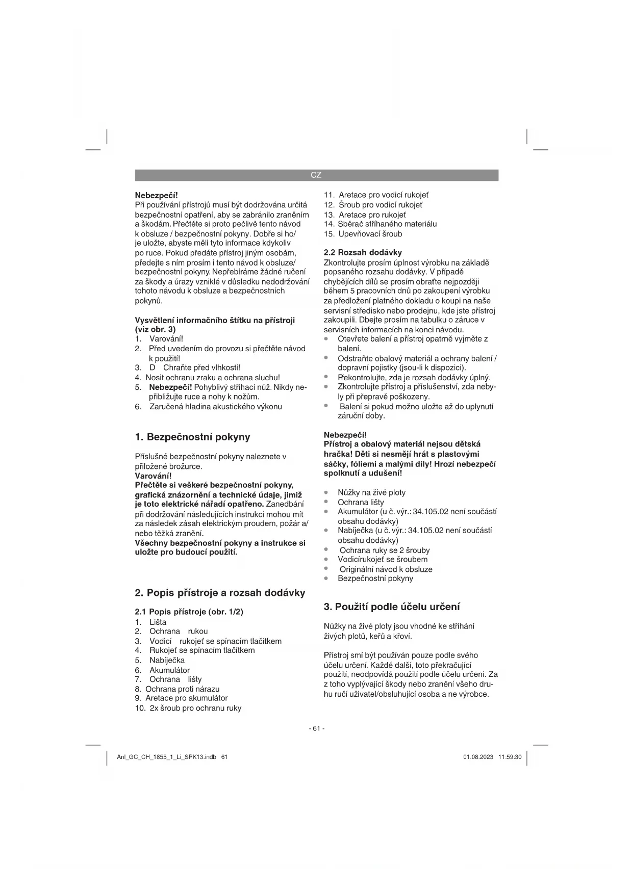 Nůžky na živé ploty jsou vhodné ke stříhání živých plotů, keřů a křoví. Přístroj smí být používán pouze podle svého účelu určení. Každé další, toto překračující použití, neodpovídá použití podle účelu určení. Za z toho vyplývající škody nebo zranění všeho dru- hu ručí uživatel/obsluhující osoba a ne výrobce. Anl_GC_CH_1855_1_Li_SPK13.indb 61Anl_GC_CH_1855_1_Li_SPK13.indb 61 01.08.2023 11:59:3001.08.2023 11:59:30CZ