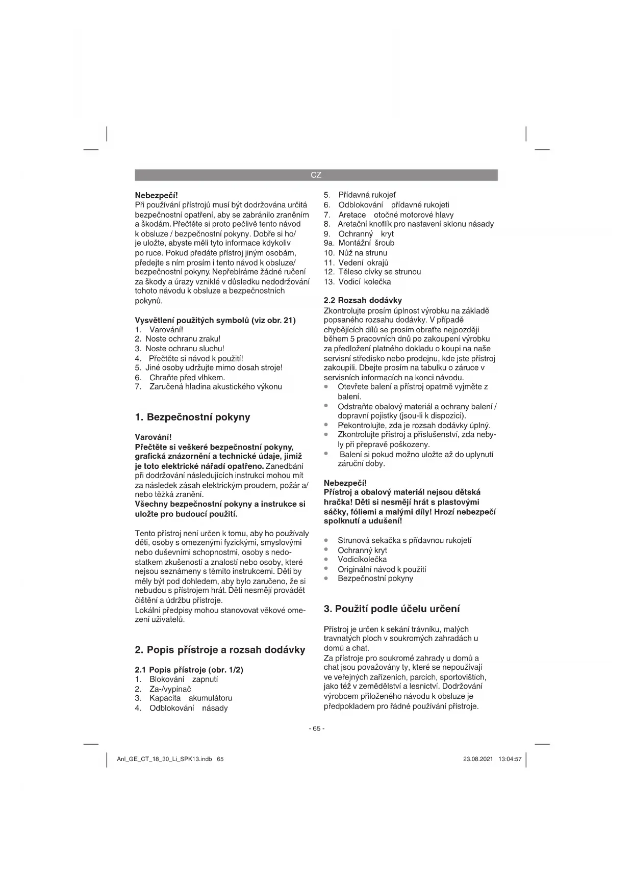 Přístroj je určen k sekání trávníku, malých travnatých ploch v soukromých zahradách u domů a chat. Za přístroje pro soukromé zahrady u domů a chat jsou považovány ty, které se nepoužívají ve veřejných zařízeních, parcích, sportovištích, jako též v zemědělství a lesnictví. Dodržování výrobcem přiloženého návodu k obsluze je předpokladem pro řádné používání přístroje. Anl_GE_CT_18_30_Li_SPK13.indb 65Anl_GE_CT_18_30_Li_SPK13.indb 65 23.08.2021 13:04:5723.08.2021 13:04:57CZ