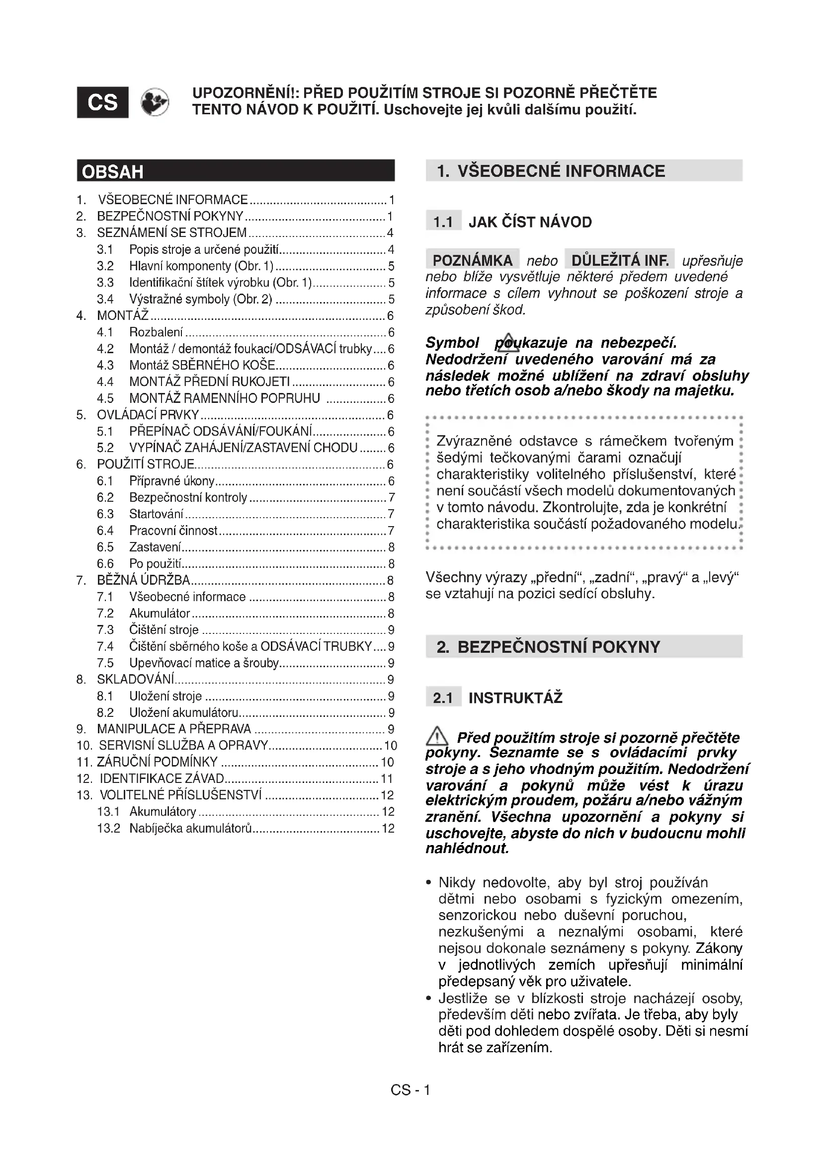 - Jestliže se v blízkosti stroje nacházejí osoby, především děti nebo zvířata. Je třeba, aby byly děti pod dohledem dospělé osoby. Děti si nesmí hrát se zařízením. OBSAH