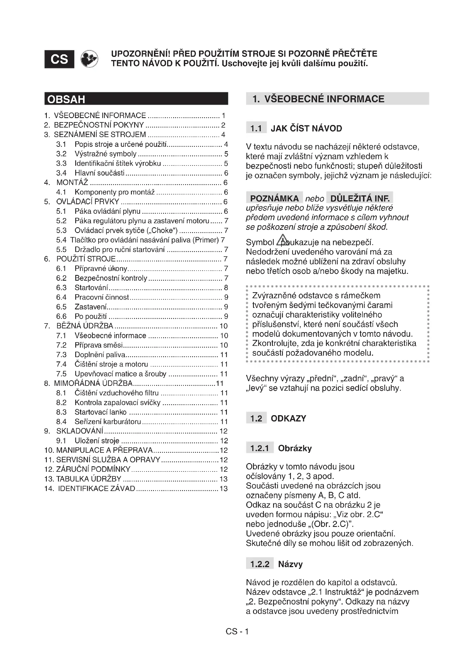 - Zamezte kontaktu paliva s oděvy, a pokud se tak stane, před spuštěním motoru se převlékněte.CS - 3