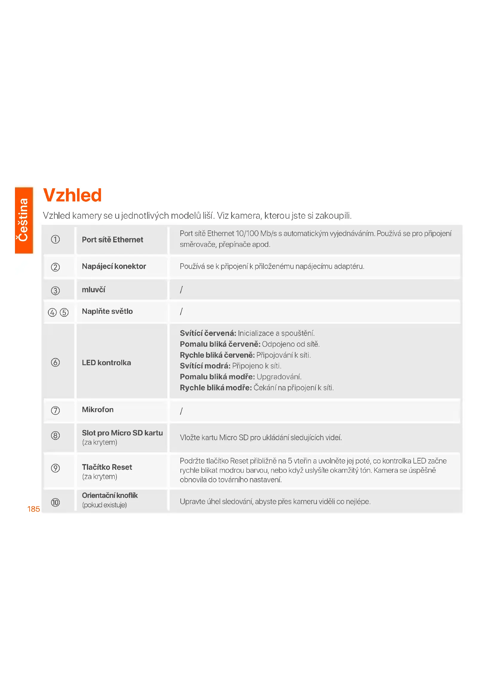 Používá se k připojení k přiloženému napájecímu adaptéru. Port sítě Ethernet 10/100 Mb/s s automatickým vyjednáváním. Používá se pro připojení směrovače, přepínače apod. Svítící červená: Inicializace a spouštění. Pomalu bliká červeně: Odpojeno od sítě. Rychle bliká červeně: Připojování k síti. Svítící modrá: Připojeno k síti. Pomalu bliká modře: Upgradování. Rychle bliká modře: Čekání na připojení k síti. Vložte kartu Micro SD pro ukládání sledujících videí. Podržte tlačítko Reset přibližně na 5 vteřin a uvolněte jej poté, co kontrolka LED začne rychle blikat modrou barvou, nebo když uslyšíte okamžitý tón. Kamera se úspěšně obnovila do továrního nastavení. Upravte úhel sledování, abyste přes kameru viděli co nejlépe. Naplňte světlo LED kontrolka Mikrofon mluvčí
