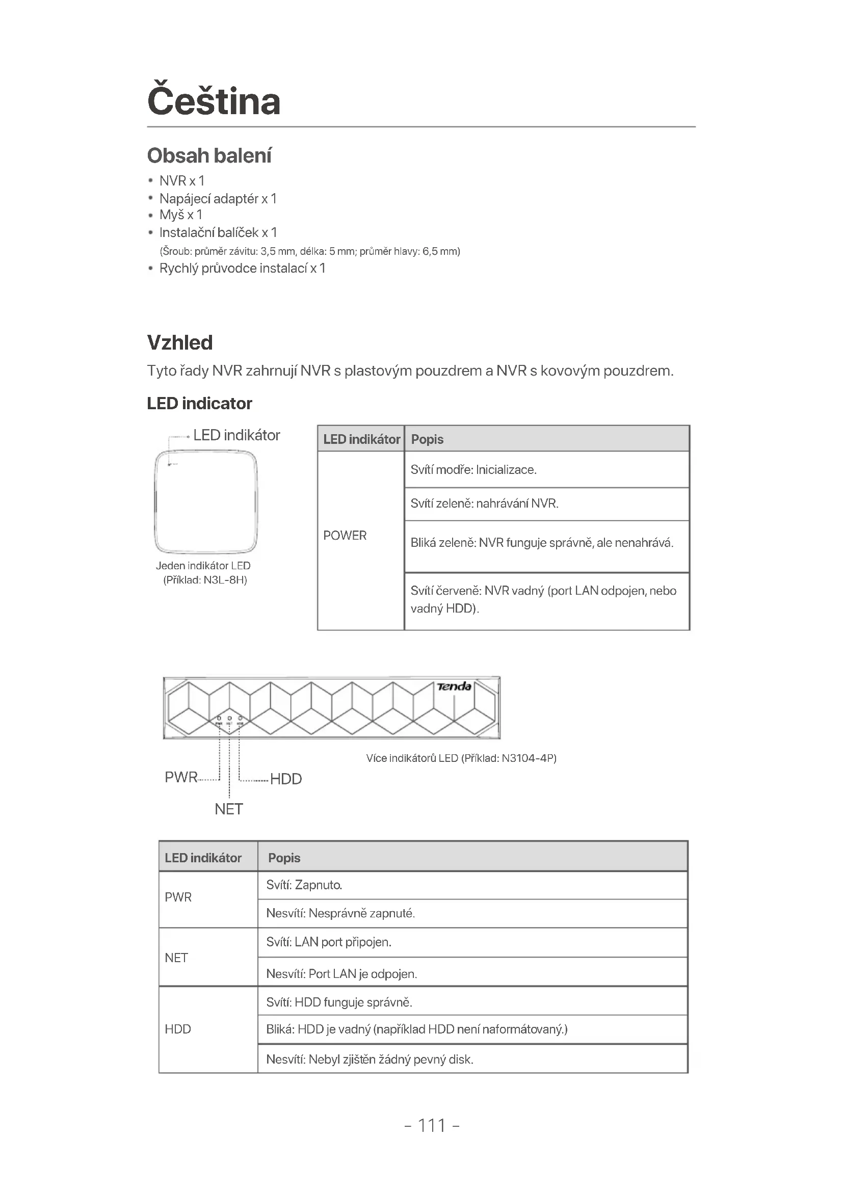 - Vypněte kameru a restartujte ji. Q4. Co mám dělat, když NVR nemůže najít kameru? A4: Pokud NVR podporuje port typu PoE a kamera byla připojena k portu PoE zařízení NVR, vyzkoušejte následující řešení: - Připojte počítač a kameru ke stejné síti a povolte funkci DHCP kamery (pomocí nástroje pro správu klientů, jako je správce zařízení ONVIF nebo webové uživatelské rozhraní kamery pro konfiguraci). - Pokud kamera patří třetí straně, ujistěte se, že kamera podporuje ONVIF a funkce ONVIF je povolená a do seznamu uživatelů byl přidán správce se správcem uživatelského jména. Pokud kamera byla připojena ke straně LAN zařízení NVR, vyzkoušejte tato řešení: - Ujistěte se, že kamera pracuje správně, a kamera je správně připojená ke spínači nebo routeru, který je připojený k zařízení NVR, a ethernetový kabel je napnutý. - Ujistěte se, že IP adresa kamery je v tomtéž síťovém segmentu jako IP adresa LANU zařízení NVR (prostřednictvím nástroje pro správu klientů, jako je správce zařízení ONVIF nebo webové uživatelské rozhraní kamery pro konfiguraci). - Pokud kamera patří třetí straně, ujistěte se, že kamera podporuje ONVIF a funkce ONVIF je povolená a do seznamu uživatelů byl přidán správce se správcem uživatelského jména. Pokud problém přetrvává, obraťte se na technickou podporu Tenda.- 121 - Deutsch Lieferumfang Erscheinung 1 x NVR1 x Netzteil1 x Maus1 x Installationspaket (Schraube: Gewindedurchmesser: 3,5 mm, Länge: 5 mm; Kopfdurchmesser: 6,5 mm)1 x Schnellstartanleitung LED-Anzeige Zu diesen NVR-Serien gehören NVRs mit Kunststoffgehäuse und NVRs mit Metallgehäuse.POWER LED-Anzeige Einzelne LED-Anzeige (Beispiel: N3L-8H)Mehrere LED-Anzeigen (Beispiel: N3104-4P) PWR NET HDD LED-Anzeige Beschreibung POWER Einfarbig blau: Initialisierung. Grün leuchtend: NVR-Aufzeichnung. Blinkt grün: NVR funktioniert einwandfrei, zeichnet aber nicht auf. Einfarbig rot: NVR fehlerhaft (LAN-Port getrennt, oder Festplatte defekt). LED-Anzeige Beschreibung PWR NET HDD Leuchtet: Eingeschaltet. Aus: Falsch eingeschaltet. Leuchtet: LAN-Port angeschlossen. Aus: LAN-Port getrennt. Leuchtet: Festplatte funktioniert einwandfrei. Blinkt: Festplatte fehlerhaft (z. B. Festplatte nicht formatiert). Aus: Keine Festplatte erkannt.-122 - Bodenplatte HDD-Schraubenloch Löcher zur Wandmontage Löcher zur Wandmontage HDD-Schraubenloch TippsWandmontagelöcher: Dienen zur Befestigung des Geräts an der Wand.Wandmontagematerialien werden selbst hergestellt. Empfohlene Spezifikationen der Kunststoffschrauben und Dübel:Schraube: Gewindedurchmesser: 3 mm, Länge: 14 mm; Kopfdurchmesser: 5.2 mmKunststoffanker: Innendurchmesser: 6,0 mm; Länge: 26,4 mm NVR mit Kunststoffgehäuse (Beispiel: N3L-8H) NVR mit Metallgehäuse (Beispiel: N3104-4P) Rückwand Stromanschluss Erdungsklemme HDMI-Port 10/100 Mbit/s LAN-Port VGA-Port PoE NVR (Example: N3104-4P) USB 2.0-Anschluss.