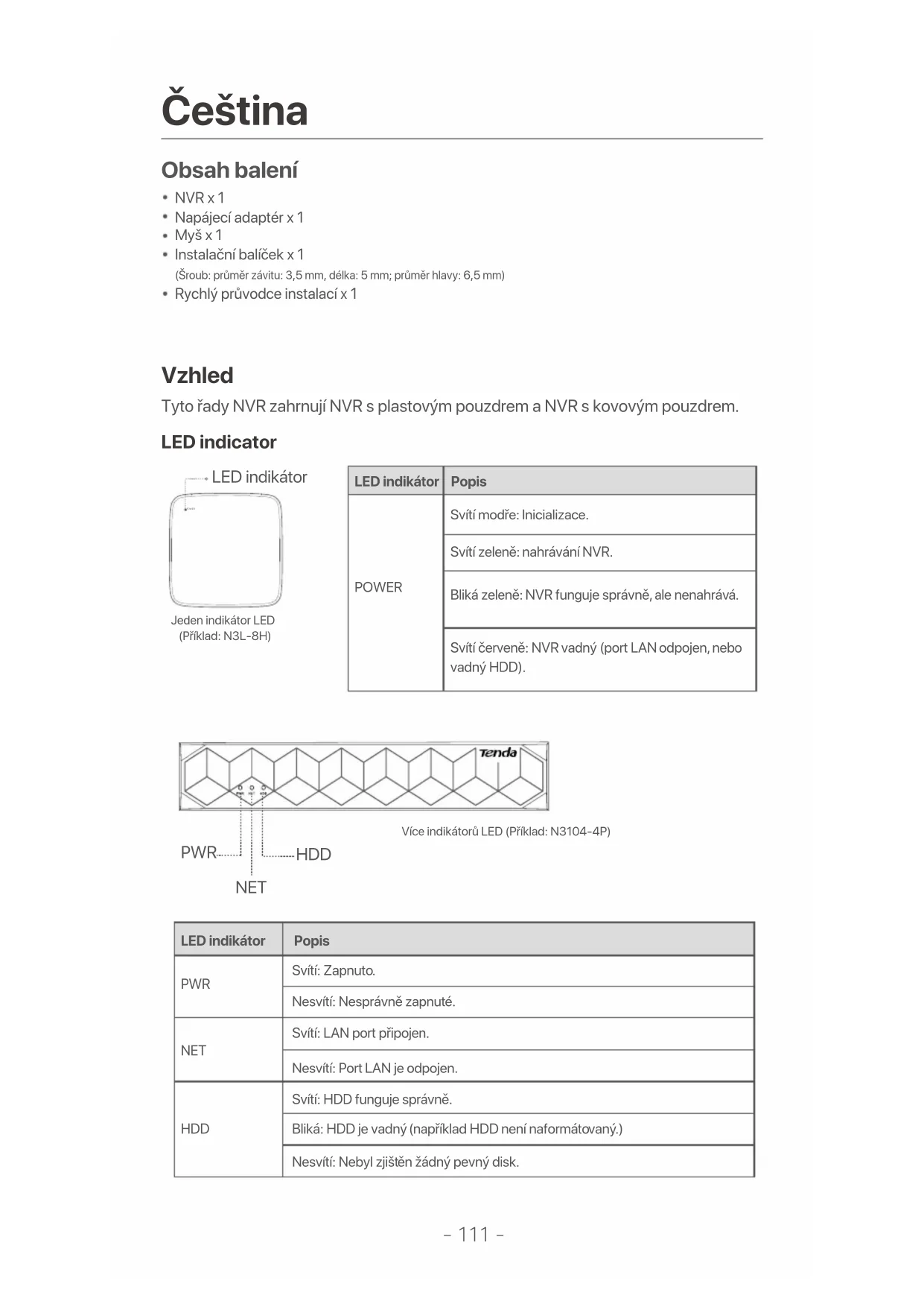 - Vypněte kameru a restartujte ji. Q4. Co mám dělat, když NVR nemůže najít kameru? A4: Pokud NVR podporuje port typu PoE a kamera byla připojena k portu PoE zařízení NVR, vyzkoušejte následující řešení: - Připojte počítač a kameru ke stejné síti a povolte funkci DHCP kamery (pomocí nástroje pro správu klientů, jako je správce zařízení ONVIF nebo webové uživatelské rozhraní kamery pro konfiguraci). - Pokud kamera patří třetí straně, ujistěte se, že kamera podporuje ONVIF a funkce ONVIF je povolená a do seznamu uživatelů byl přidán správce se správcem uživatelského jména. Pokud kamera byla připojena ke straně LAN zařízení NVR, vyzkoušejte tato řešení: - Ujistěte se, že kamera pracuje správně, a kamera je správně připojená ke spínači nebo routeru, který je připojený k zařízení NVR, a ethernetový kabel je napnutý. - Ujistěte se, že IP adresa kamery je v tomtéž síťovém segmentu jako IP adresa LANU zařízení NVR (prostřednictvím nástroje pro správu klientů, jako je správce zařízení ONVIF nebo webové uživatelské rozhraní kamery pro konfiguraci). - Pokud kamera patří třetí straně, ujistěte se, že kamera podporuje ONVIF a funkce ONVIF je povolená a do seznamu uživatelů byl přidán správce se správcem uživatelského jména. Pokud problém přetrvává, obraťte se na technickou podporu Tenda.- 121 - Deutsch Lieferumfang Erscheinung 1 x NVR1 x Netzteil1 x Maus1 x Installationspaket (Schraube: Gewindedurchmesser: 3,5 mm, Länge: 5 mm; Kopfdurchmesser: 6,5 mm)1 x Schnellstartanleitung LED-Anzeige Zu diesen NVR-Serien gehören NVRs mit Kunststoffgehäuse und NVRs mit Metallgehäuse.POWER LED-Anzeige Einzelne LED-Anzeige (Beispiel: N3L-8H)Mehrere LED-Anzeigen (Beispiel: N3104-4P) PWR NET HDD LED-Anzeige Beschreibung POWER Einfarbig blau: Initialisierung. Grün leuchtend: NVR-Aufzeichnung. Blinkt grün: NVR funktioniert einwandfrei, zeichnet aber nicht auf. Einfarbig rot: NVR fehlerhaft (LAN-Port getrennt, oder Festplatte defekt). LED-Anzeige Beschreibung PWR NET HDD Leuchtet: Eingeschaltet. Aus: Falsch eingeschaltet. Leuchtet: LAN-Port angeschlossen. Aus: LAN-Port getrennt. Leuchtet: Festplatte funktioniert einwandfrei. Blinkt: Festplatte fehlerhaft (z. B. Festplatte nicht formatiert). Aus: Keine Festplatte erkannt.-122 - Bodenplatte HDD-Schraubenloch Löcher zur Wandmontage Löcher zur Wandmontage HDD-Schraubenloch TippsWandmontagelöcher: Dienen zur Befestigung des Geräts an der Wand.Wandmontagematerialien werden selbst hergestellt. Empfohlene Spezifikationen der Kunststoffschrauben und Dübel:Schraube: Gewindedurchmesser: 3 mm, Länge: 14 mm; Kopfdurchmesser: 5.2 mmKunststoffanker: Innendurchmesser: 6,0 mm; Länge: 26,4 mm NVR mit Kunststoffgehäuse (Beispiel: N3L-8H) NVR mit Metallgehäuse (Beispiel: N3104-4P) Rückwand Stromanschluss Erdungsklemme HDMI-Port 10/100 Mbit/s LAN-Port VGA-Port PoE NVR (Example: N3104-4P) USB 2.0-Anschluss.