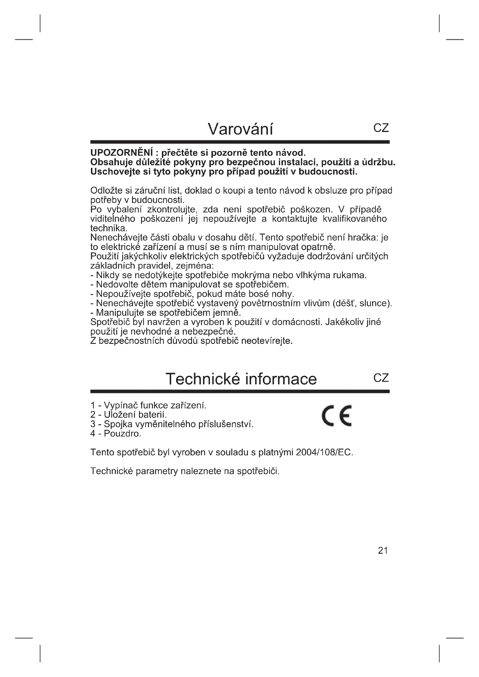 UPOZORNĚNÍ : přečtěte si pozorně tento návod. Obsahuje důležité pokyny pro bezpečnou instalaci, použití a údržbu. Uschovejte si tyto pokyny pro případ použití v budoucnosti. Odložte si záruční list, doklad o koupi a tento návod k obsluze pro případ potřeby v budoucnosti. Po vybalení zkontrolujte, zda není spotřebič poškozen. V případě viditelného poškození jej nepoužívejte a kontaktujte kvalikovaného technika. Nenechávejte části obalu v dosahu dětí. Tento spotřebič není hračka: je to elektrické zařízení a musí se s ním manipulovat opatrně. Použití jakýchkoliv elektrických spotřebičů vyžaduje dodržování určitých základních pravidel, zejména: - Nikdy se nedotýkejte spotřebiče mokrýma nebo vlhkýma rukama. - Nedovolte dětem manipulovat se spotřebičem. - Nepoužívejte spotřebič, pokud máte bosé nohy. - Nenechávejte spotřebič vystavený povětrnostním vlivům (déšť, slunce). - Manipulujte se spotřebičem jemně. Spotřebič byl navržen a vyroben k použití v domácnosti. Jakékoliv jiné použití je nevhodné a nebezpečné. Z bezpečnostních důvodů spotřebič neotevírejte.