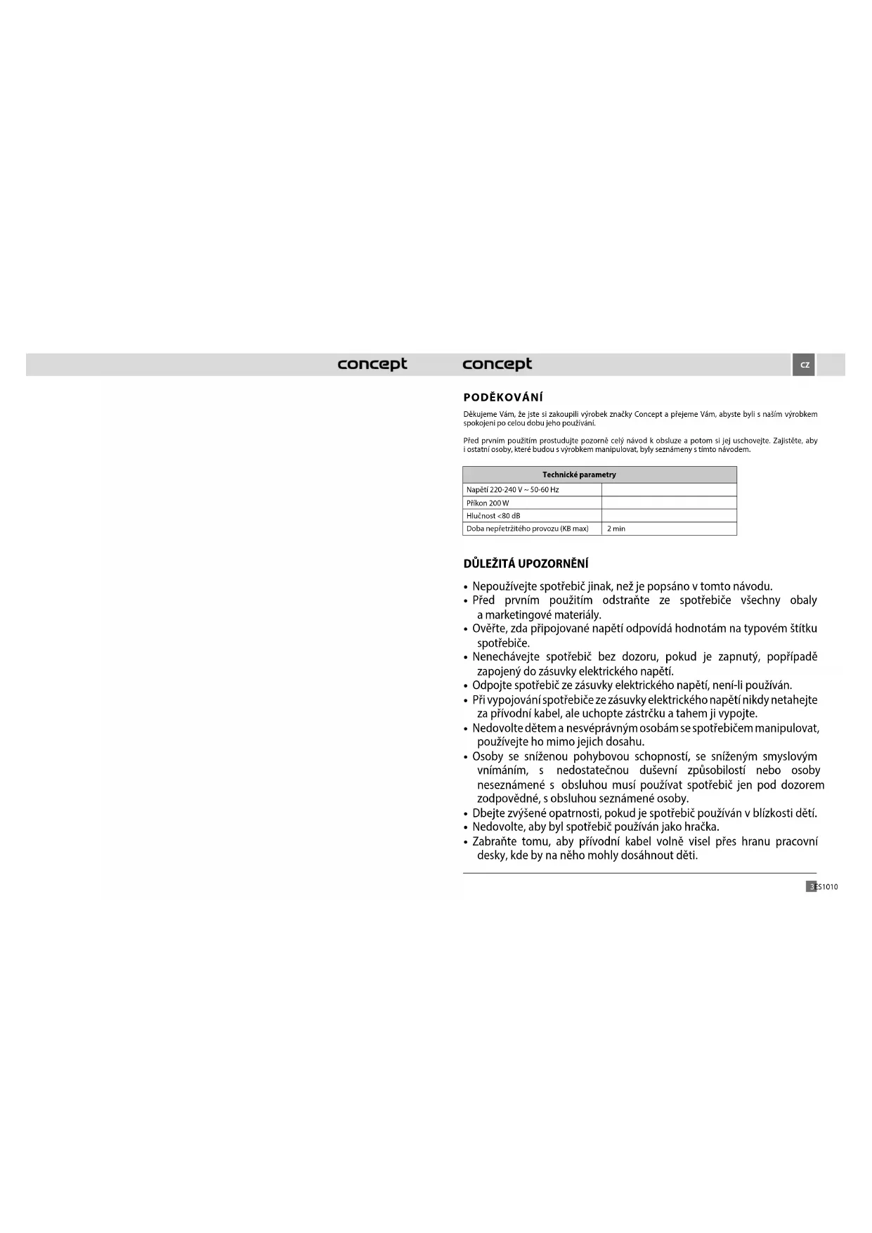 Děkujeme Vám, že jste si zakoupili výrobek značky Concept a přejeme Vám, abyste byli s naším výrobkem spokojeni po celou dobu jeho používání. Před prvním použitím prostudujte pozorně celý návod k obsluze a potom si jej uschovejte. Zajistěte, aby