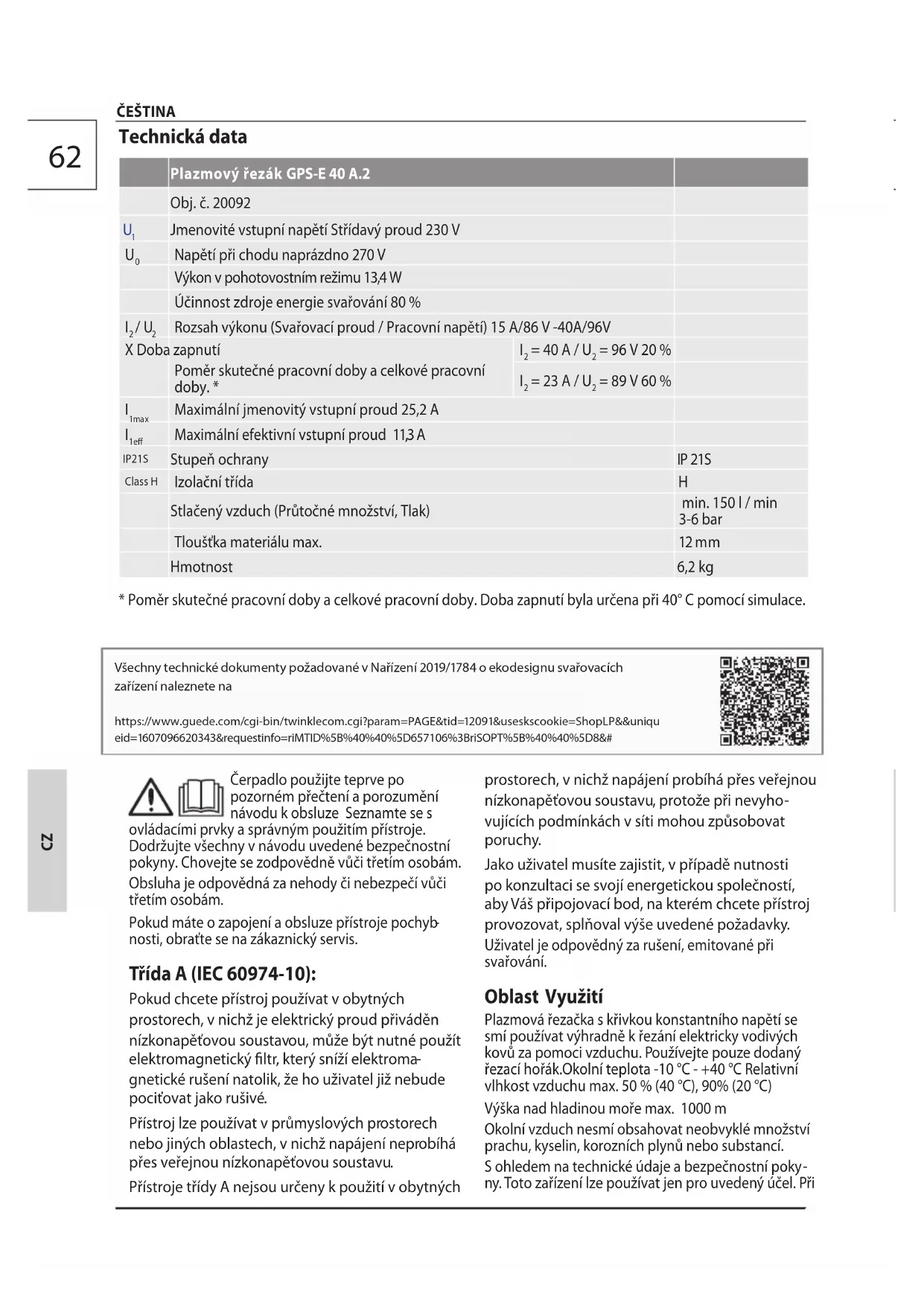 ny. Toto zařízení lze používat jen pro uvedený účel. Při Všechny technické dokumenty požadované v Nařízení 2019/1784 o ekodesignu svařovacích zařízení naleznete na