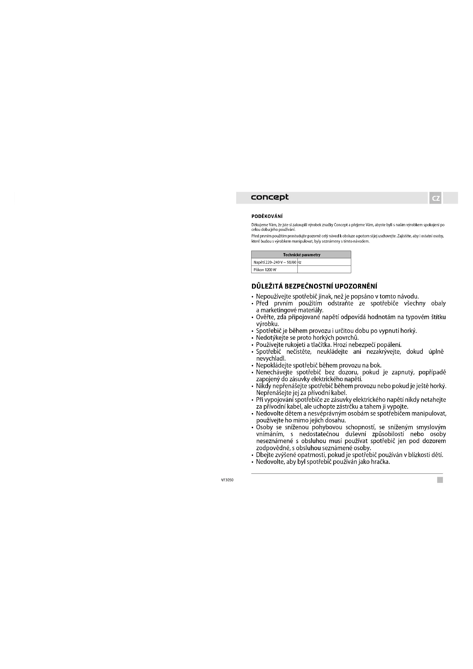 Děkujeme Vám, že jste si zakoupili výrobek značky Concept a přejeme Vám, abyste byli s naším výrobkem spokojeni po celou dobu jeho používání. Před prvním použitím prostudujte pozorně celý návod k obsluze a potom si jej uschovejte. Zajistěte, aby i ostatní osoby, které budou s výrobkem manipulovat, byly seznámeny s tímto návodem. Technické parametry Napětí 220–240 V ~ 50/60 Hz Příkon 1200 W DŮLEŽITÁ BEZPEČNOSTNÍ UPOZORNĚNÍ