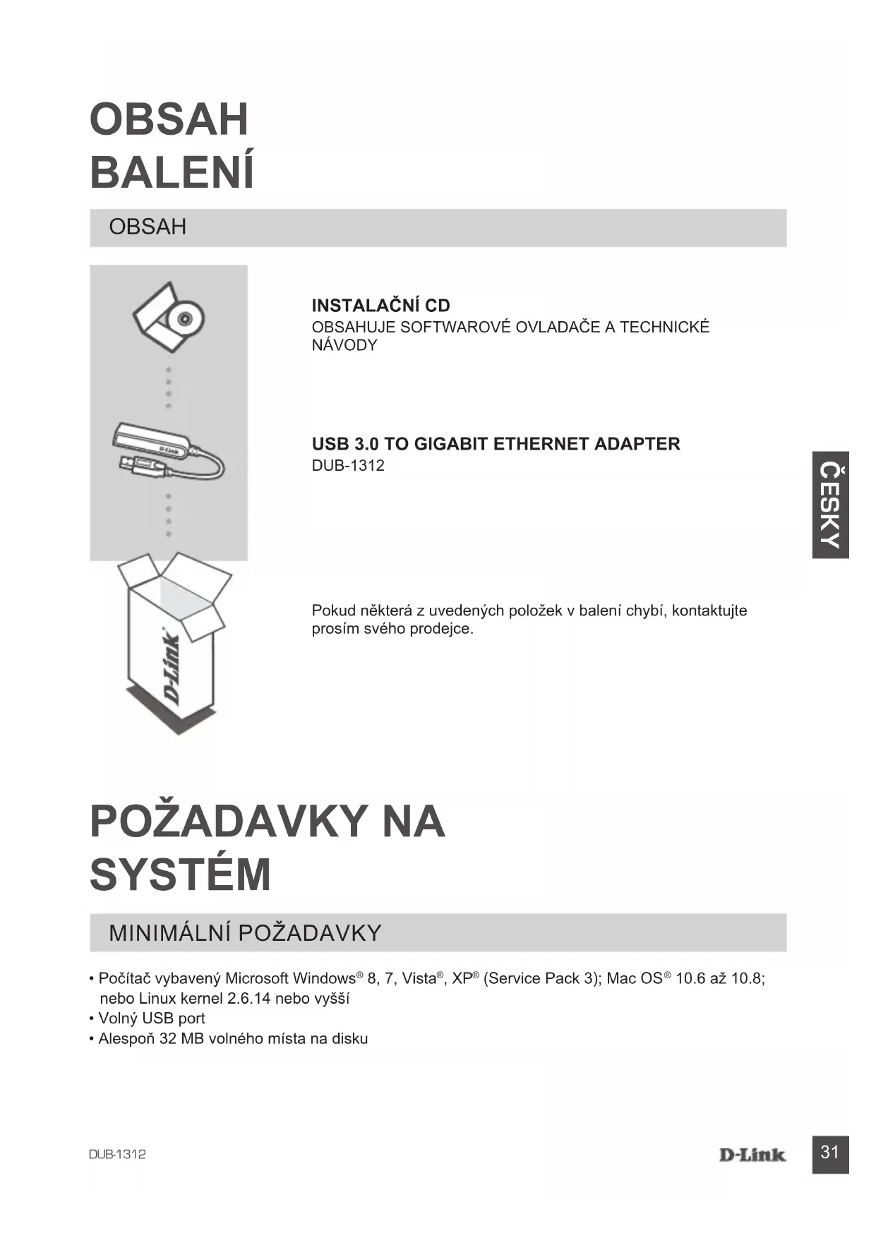 NÁVODY USB 3.0 TO GIGABIT ETHERNET AdAPTER DUB-1312 OBSAH Pokud některá z uvedených položek v balení chybí, kontaktujte prosím svého prodejce.