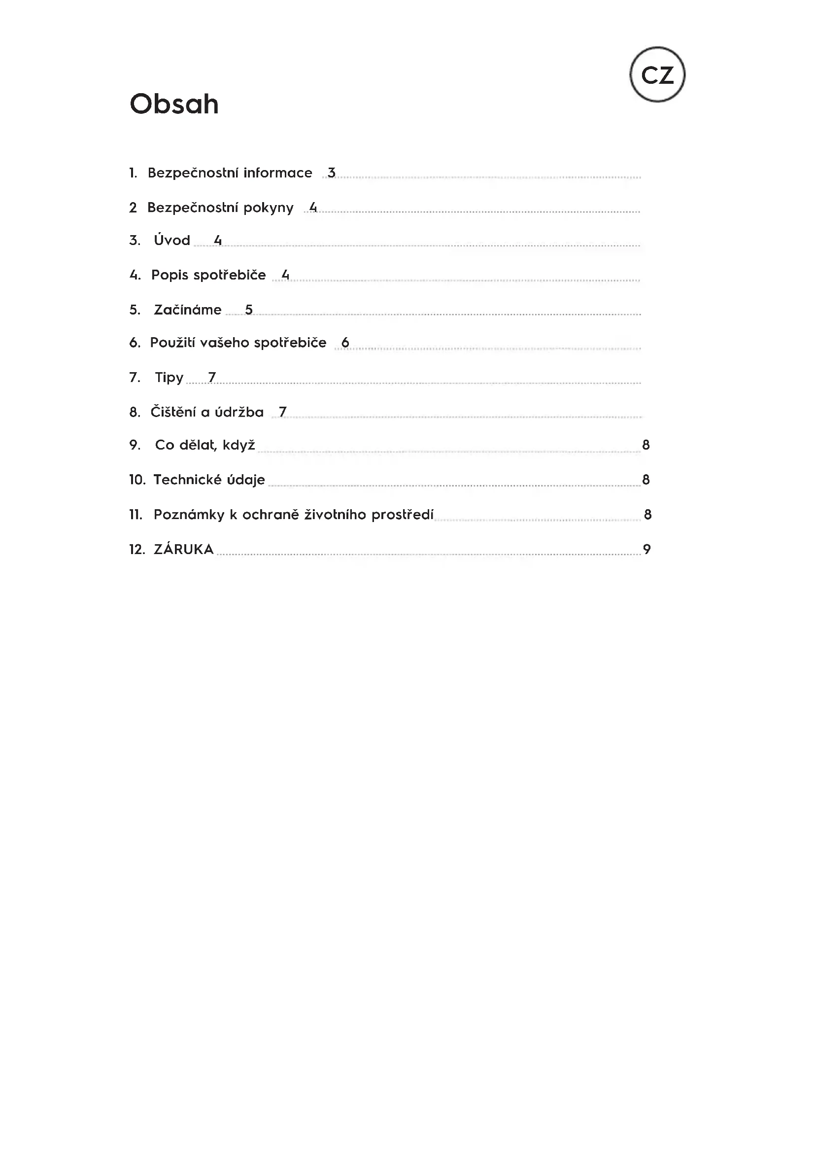 Symbol na spotřebiči nebo jeho obalu udává, že¬tento výrobek nepatří do domácího odpadu. Je nutné odvézt ho do příslušného sběrného dvora k recyklaci elektrických a elektronických zařízení. Zajištěním správné likvidace tohoto výrobku pomůžete zabránit případným negativním dopadům na životní prostředí a lidské zdraví, které by jinak mohly být způsobeny jeho nevhodnou likvidací. Podrobnější informace o recyklaci tohoto výrobku zjistíte u příslušného místního úřadu, služby pro likvidaci domovního odpadu nebo v obchodě, kde jste výrobek zakoupili. Obalové materiály Materiály označené symbolem i jsou recyklovatelné. Všechny obaly zlikvidujte v příslušných kontejnerech k recyklaci.