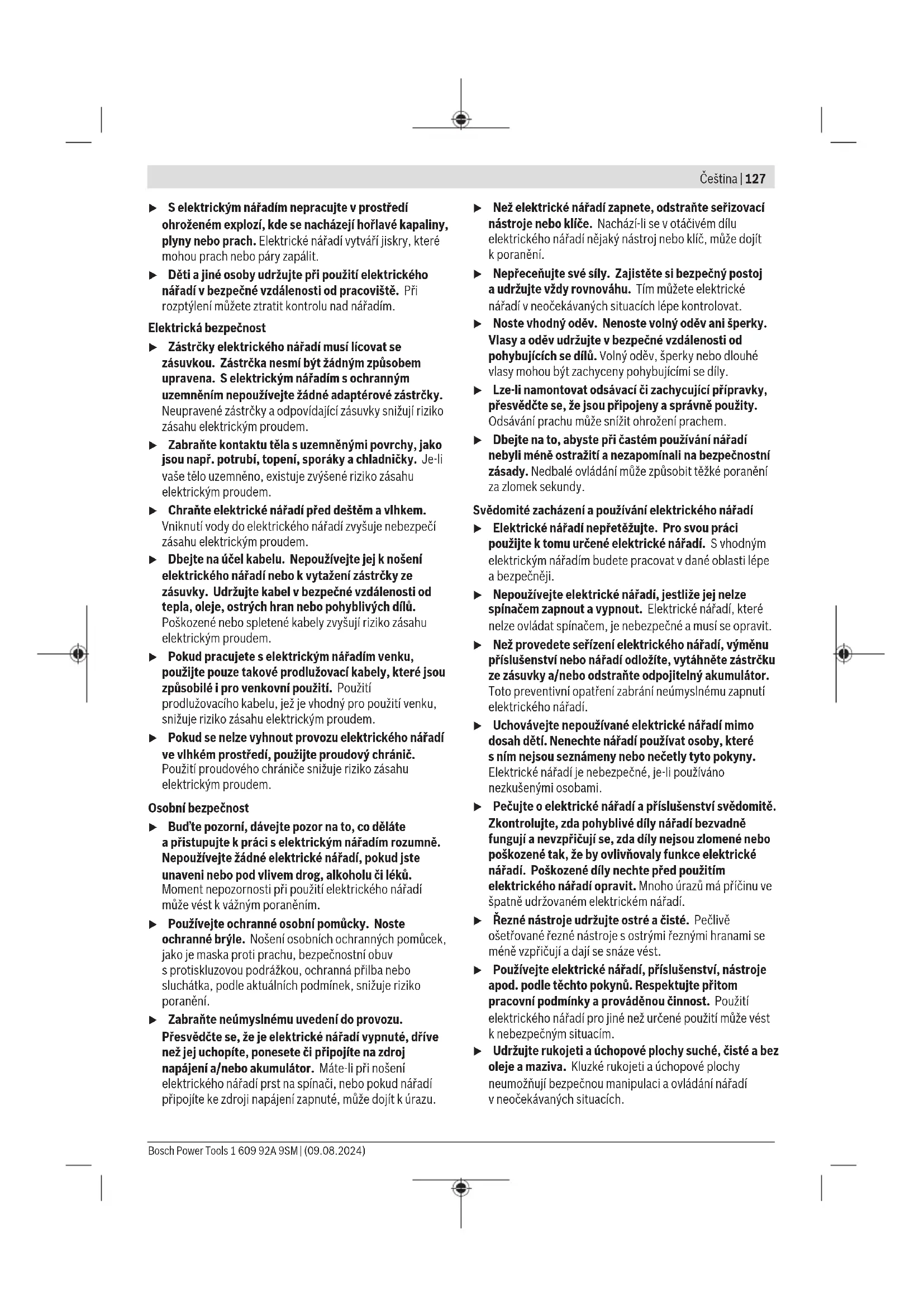 Nm 27 27 27 27 15 15 20 Utahovací moment na přírubě Nm 20 20 20 20 15 15 20 Hmotnost kg 0,20 0,20 0,20 0,20 0,15 0,15 0,05 A) Homologaci podle VDI 2647 si lze stáhnout na domovské stránce www.bosch-professional.com. Hodnoty se mohou podle výrobku lišit amají na ně vliv podmínky použití aprostředí. Další informace najdete na www.bosch-professional.com/wac. Informace ohluku avibracích Hodnoty hlučnosti zjištěné podle EN62841-2-2. Vážená hodnota hladiny akustického tlaku strojeA je typicky menší než 70dB(A). Hladina hluku může při práci překročit uvedené hodnoty. Noste chrániče sluchu! 1 609 92A 9SM | (09.08.2024) Bosch Power ToolsČeština | 131 Celkové hodnoty vibrací a