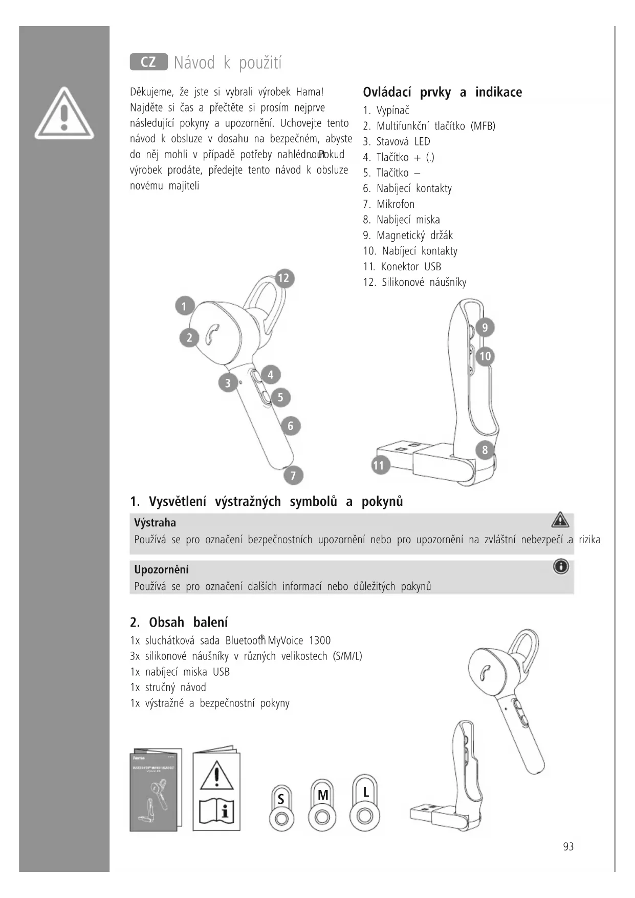 MyVoice 1300 3x silikonové náušníky v různých velikostech (S/M/L) 1x nabíjecí miska USB 1x stručný návod 1x výstražné a bezpečnostní pokyny