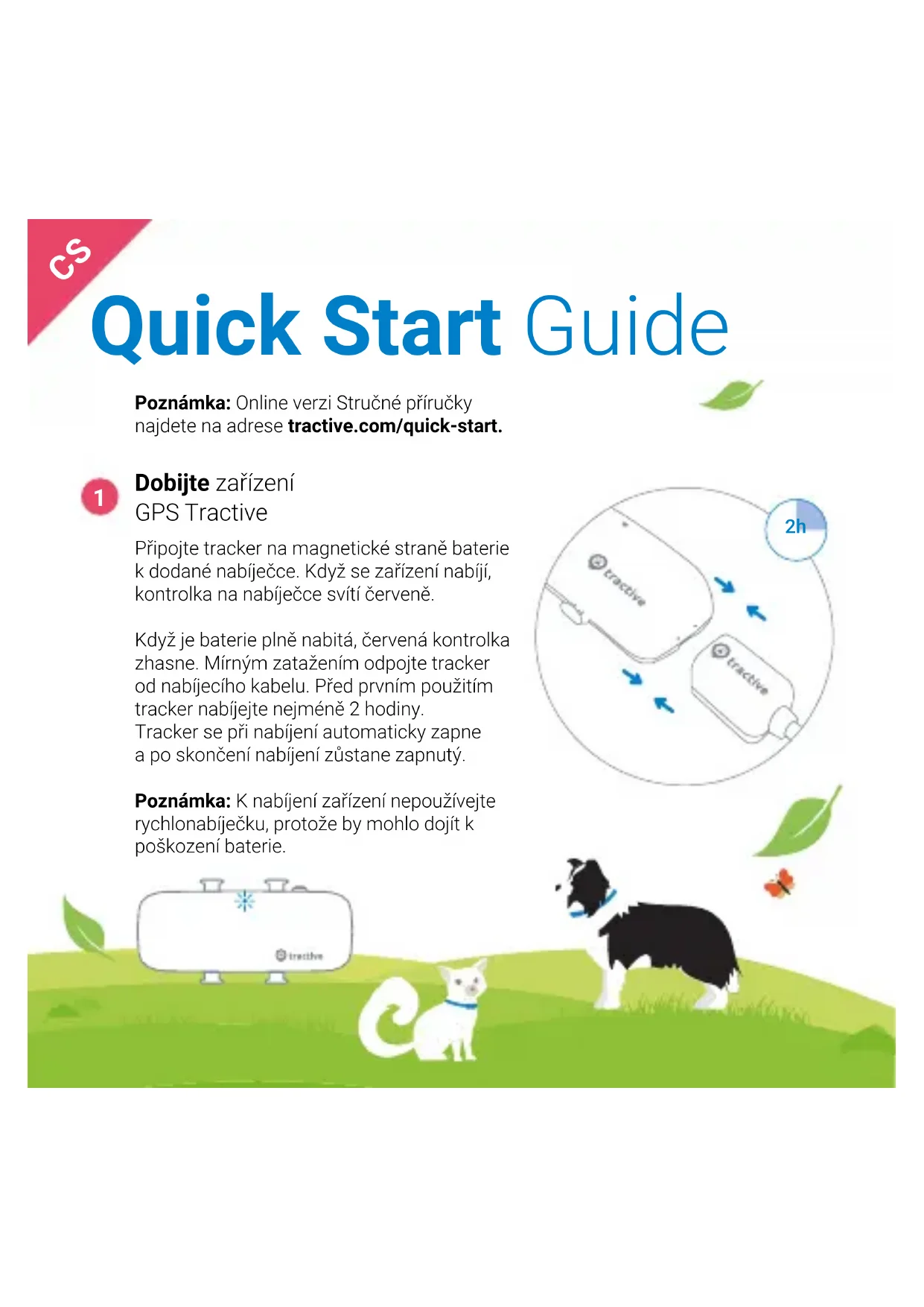 Dobijte zařízení GPS Tractive Připojte tracker na magnetické straně baterie k dodané nabíječce. Když se zařízení nabíjí, kontrolka na nabíječce svítí červeně. Když je baterie plně nabitá, červená kontrolka zhasne. Mírným zatažením odpojte tracker od nabíjecího kabelu. Před prvním použitím tracker nabíjejte nejméně 2 hodiny. Tracker se při nabíjení automaticky zapne a po skončení nabíjení zůstane zapnutý. Poznámka: K nabíjení zařízení nepoužívejte rychlonabíječku, protože by mohlo dojít k poškození baterie. Poznámka: Online verzi Stručné příručky najdete na adrese tractive.com/quick-start.2