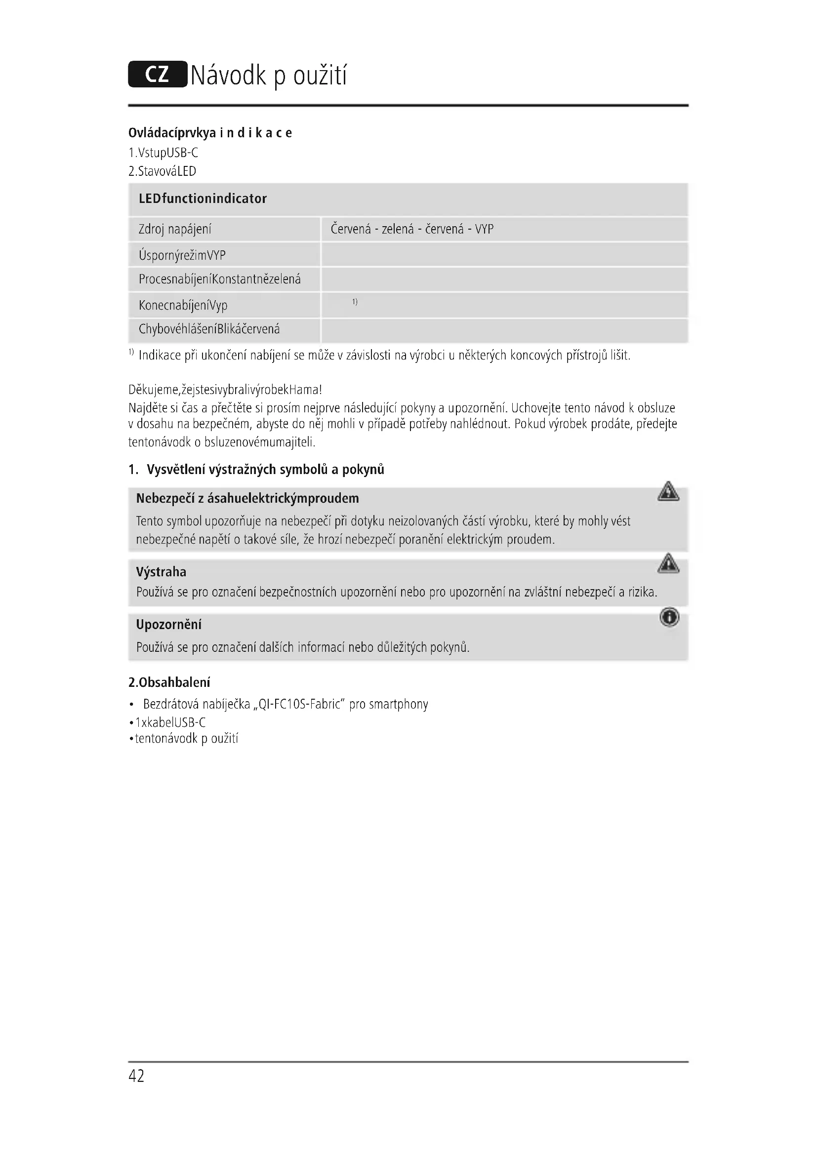 LED function indicator Zdroj prúdu červená –zelená – červená –vyp. Pohotovostný režim Vyp. Proces nabíjania Trvalá zelená Koniec nabíjania Vyp.
