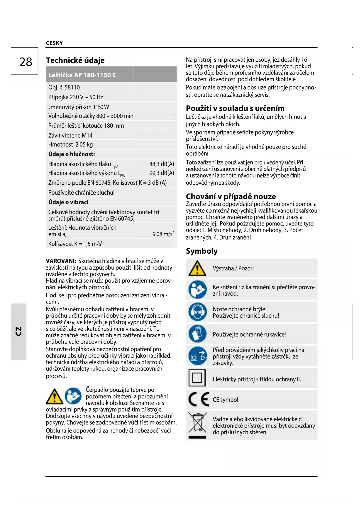 CESKY Technické údaje Leštička AP 180-1150 E Obj. č. 58110 Přípojka 230 V ~ 50 Hz Jmenovitý příkon 1150 W Volnoběžné otáčky 800 – 3000 min