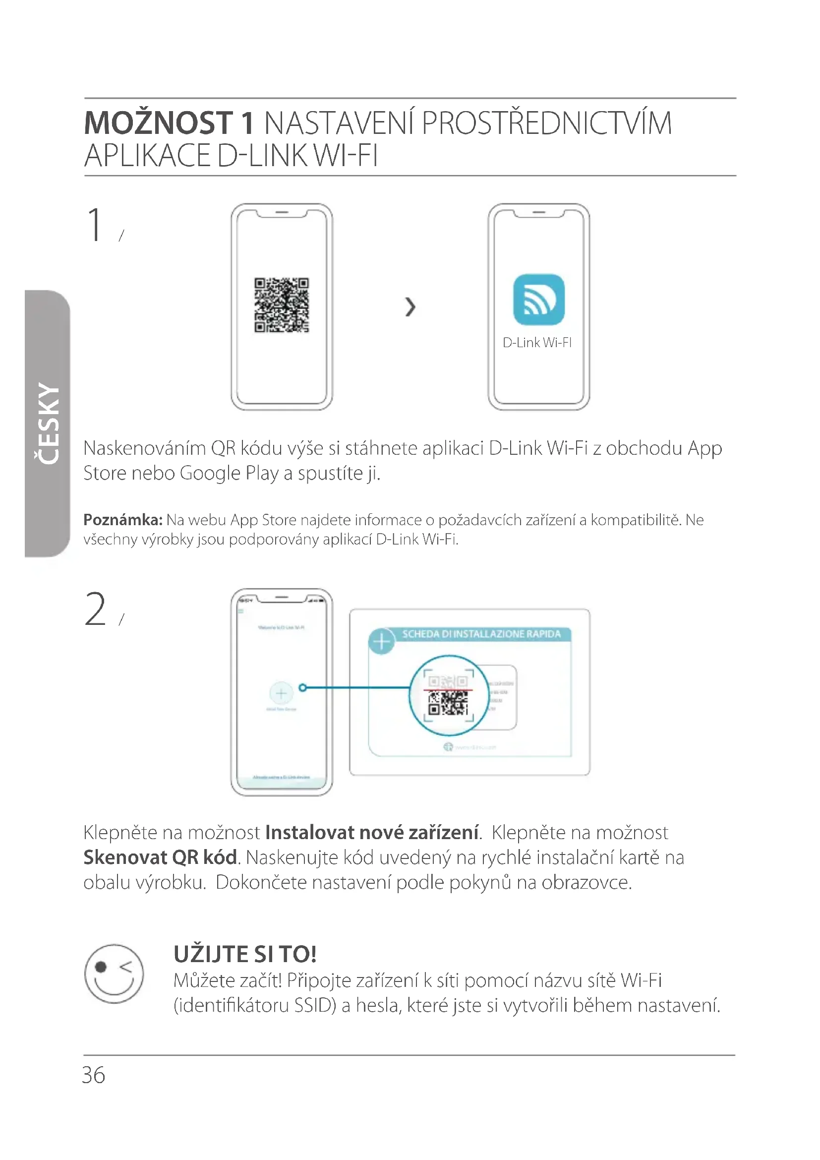 1 / Zapojte extendér do zdroje napájení poblíž routeru. 2 / Vyčkejte, dokud LED kontrolka napájení extendéru nezačne blikat oranžově.Poznámka: Konkrétní nastavení LED kontrolek najdete v uživatelské příručce zařízení. < 1 m < 1 m38 ČESKY UŽIJTE SI TO! Můžete začít! Připojte zařízení k síti pomocí názvu sítě Wi-Fi (identifikátoru SSID) a hesla, které jste si vytvořili během nastavení. Do řádku adresy ve webovém prohlížeči zadejte http://dlinkap. local./. Dokončete nastavení podle pokynů na obrazovce. 4 / 3 / Připojte počítač pomocí názvu sítě a hesla Wi-Fi vytištěného na stručné instalační kartě nebo na štítku zařízení.