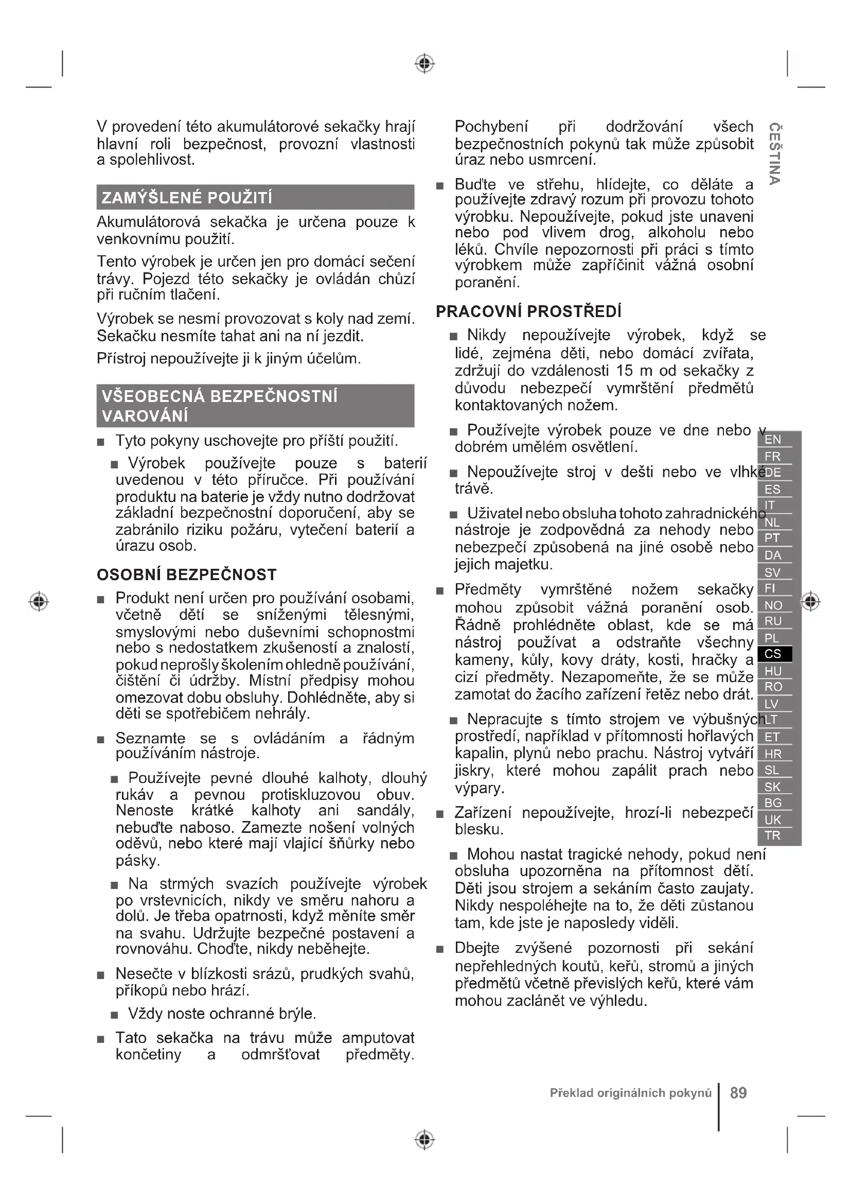 ■ Nikdy nepoužívejte výrobek, když se lidé, zejména děti, nebo domácí zvířata, zdržují do vzdálenosti 15 m od sekačky z důvodu nebezpečí vymrštění předmětů kontaktovaných nožem. ■ Používejte výrobek pouze ve dne nebo v dobrém umělém osvětlení. ■ Nepoužívejte stroj v dešti nebo ve vlhké trávě. ■ Uživatel nebo obsluha tohoto zahradnického nástroje je zodpovědná za nehody nebo nebezpečí způsobená na jiné osobě nebo jejich majetku. ■ Předměty vymrštěné nožem sekačky mohou způsobit vážná poranění osob. Řádně prohlédněte oblast, kde se má nástroj používat a odstraňte všechny kameny, kůly, kovy dráty, kosti, hračky a cizí předměty. Nezapomeňte, že se může zamotat do žacího zařízení řetěz nebo drát. ■ Nepracujte s tímto strojem ve výbušných prostředí, například v přítomnosti hořlavých kapalin, plynů nebo prachu. Nástroj vytváří jiskry, které mohou zapálit prach nebo výpary. ■ Zařízení nepoužívejte, hrozí-li nebezpečí blesku. ■ Mohou nastat tragické nehody, pokud není obsluha upozorněna na přítomnost dětí. Děti jsou strojem a sekáním často zaujaty. Nikdy nespoléhejte na to, že děti zůstanou tam, kde jste je naposledy viděli. ■ Dbejte zvýšené pozornosti při sekání nepřehledných koutů, keřů, stromů a jiných předmětů včetně převislých keřů, které vám mohou zaclánět ve výhledu.90 Překlad originálních pokynů POUŽITÍ A PÉČE O NÁSTROJ NA BATERIE ■ Přečtěte, pochopte a vždy dodržujte bezpečnostní pokyny dodané k akumulátoru a nabíječce. Nedodržování těchto pokynů může způsobit úraz elektřinou, požár či jiná nebezpečí. Tento návod k používání uložte na bezpečném místě k pozdějšímu nahlížení. ■ Přístroje na akumulátory se nepřipojují do elektrické sítě; proto jsou vždy v provozním stavu. Odeberte odpojovací klíč, když nepracujete s výrobkem. ■ Před prováděním jakékoliv údržby, seřizováním, odstraňováním materiálu nebo před čištěním výrobku vytáhněte akumulátor. ■ Zkontrolujte, že je odpojovací klíč před vložením akumulátoru vyjmut. ■ Dobíjejte akumulátor pouze nabíječkou určenou výrobcem. Použití nekompatibilní baterie s nabíječkou může způsobit nebezpečí požáru. Akumulátor používejte pouze s nabíječkou v seznamu. ■ Výrobek používejte pouze s přesně určeným akumulátorem. Použití jakéhokoliv jiného akumulátoru může způsobit nebezpečí poranění, úrazu elektřinou a požáru. ■ Pokud akumulátor nepoužíváte, uchovávejte jej mimo kovové předměty jako svorky pro papír, mince, klíče, hřebíky, šrouby nebo jiné malé kovové předměty, které mohou vytvořit propojení jednoho vývodu s druhým. Zkratování svorek akumulátorové sady může vést k jiskření, popáleninám, požáru nebo výbuchu. ■ Neumisťujte přístroje na baterie nebo jeho baterie blízko ohně nebo tepla. Tím se zvyšuje riziko výbuchu a možného zranění. ■ Baterii nerozebírejte ani nedeformujte. Uniklý elektrolyt je korozívní a může poškozovat oči neb kůži. Může ublížit, spolkne-li se. ■ Nevystavujte akumulátor působení vlhkosti a vody. Nástroj na baterie nenabíjejte ve vlhkých ani mokrých prostředích. Tím se sníží riziko elektrického šoku. ■ V případě poškození a nesprávného používání baterie mohou unikat výpary. Zajistěte čerstvý vzduch a v případě komplikací vyhledejte lékařskou pomoc. Výpary mohou dráždit dýchací systém. ■ Nenechávejte akumulátorovou sadu uvnitř vozidla v horkém nebo chladném prostředí. ■ Baterii nepalte. ■ Za nevhodných podmínek může z baterie vytékat kapalina; zabraňte kontaktu. Pokud dojde k náhodnému kontaktu, omyjte vodou. Pokud kapalina přijde do kontaktu s očima, ihned vyhledejte lékařskou pomoc. Kapalina vytečená z baterie způsobit podráždění nebo popáleniny.