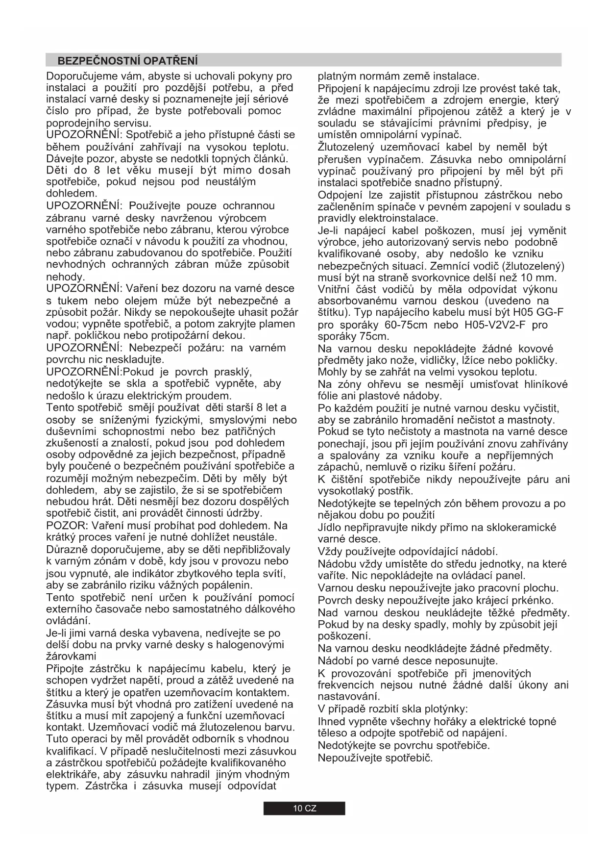 platným normám země instalace. K čištění spotřebiče nikdy nepoužívejte páru ani vysokotlaký postřik. Je-li napájecí kabel poškozen, musí jej vyměnit výrobce, jeho autorizovaný servis nebo podobně kvalifikované osoby, aby nedošlo ke vzniku nebezpečných situací. Zemnící vodič (žlutozelený) musí být na straně svorkovnice delší než 10 mm. Vnitřní část vodičů by měla odpovídat výkonu absorbovanému varnou deskou (uvedeno na štítku). Typ napájecího kabelu musí být H05 GG-F pro sporáky 60-75cm nebo H05-V2V2-F pro sporáky 75cm. Na zóny ohřevu se nesmějí umisťovat hliníkové fólie ani plastové nádoby. Varnou desku nepoužívejte jako pracovní plochu. Na varnou desku neodkládejte žádné předměty. Připojení k napájecímu zdroji lze provést také tak, že mezi spotřebičem a zdrojem energie, který zvládne maximální připojenou zátěž a který je v souladu se stávajícími právními předpisy, je umístěn omnipolární vypínač. Žlutozelený uzemňovací kabel by neměl být přerušen vypínačem. Zásuvka nebo omnipolární vypínač používaný pro připojení by měl být při instalaci spotřebiče snadno přístupný. Odpojení lze zajistit přístupnou zástrčkou nebo začleněním spínače v pevném zapojení v souladu s pravidly elektroinstalace. Na varnou desku nepokládejte žádné kovové předměty jako nože, vidličky, lžíce nebo pokličky. Mohly by se zahřát na velmi vysokou teplotu. Po každém použití je nutné varnou desku vyčistit, aby se zabránilo hromadění nečistot a mastnoty. Pokud se tyto nečistoty a mastnota na varné desce ponechají, jsou při jejím používání znovu zahřívány a spalovány za vzniku kouře a nepříjemných zápachů, nemluvě o riziku šíření požáru. Nedotýkejte se tepelných zón během provozu a po nějakou dobu po použití Jídlo nepřipravujte nikdy přímo na sklokeramické varné desce. Vždy používejte odpovídající nádobí. Nádobu vždy umístěte do středu jednotky, na které vaříte. Nic nepokládejte na ovládací panel. Povrch desky nepoužívejte jako krájecí prkénko. Nad varnou deskou neukládejte těžké předměty. Pokud by na desky spadly, mohly by způsobit její poškození. Nádobí po varné desce neposunujte. V případě rozbtí skla plotýnky: Ihned vypněte všechny hořáky a elektrcké topné těleso a odpojte spotřebč od napájení. K provozování spotřebče př jmenovtých frekvencích nejsou nutné žádné další úkony an nastavování. Nepoužívejte spotřebč. Nedotýkejte se povrchu spotřebče.Vzdálenost mezi varnou deskou a spotřebičem nad ní (např. odsavač par) musí být nejméně 70 cm (obrázek 4). Důležité - Obrázek 1 znázorňuje aplikaci těsnění. Varnou desku lze instalovat do pracovní desky, která je z teplu odolného materiálu do 100°C a má tloušťku 25-45 mm. Rozměry výřezu v pracovní desce jsou na obrázku 2. Pokud není volný prostor mezi varnou deskou a skříňkou pod ní, je nutné instalovat vhodné mezidno (dřevěné nebo z podobného materiálu) (obrázek 2). Pokud je varná deska připevněná k nábytku na kterékoli straně, vzdálenost mezi varnou deskou a nábytkem musí být nejméně 17 cm (60 cm) nebo 25 cm (75 cm) (viz obrázek 2); zatímco vzdálenost mezi varnou deskou a zadní stěnou musí být nejméně 70 mm. Kovové předměty v zásuvce mohou v důsledku recirkulace vzduchu dosáhnout vysokých teplot. Doporučuje se proto použít dřevěnou vložku. Varná deska se upevňuje pomocí dodaných upevňovacích svorek, pomocí otvorů ve spodní části spotřebiče. Pokud je 60 cm alebo 75 cm varná deska nad troubou, musí být přidán chladicí Ventilátor. 11 CZ