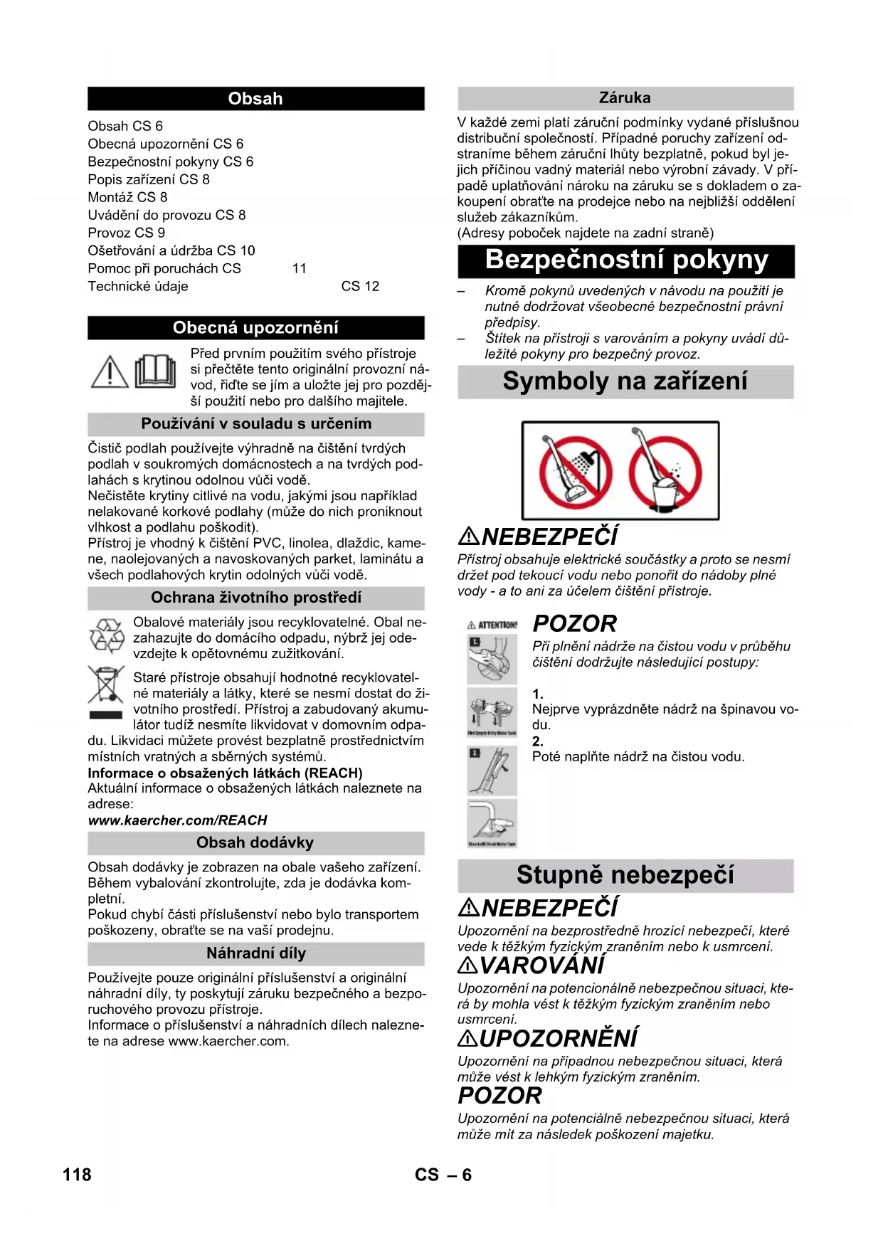 Készülék névleges teljesítmé- nye 40 W Akku névleges feszültsége 7,2-7,4 V Akku típus Li-ion Üzemidő teljes akkufeltöltés esetén 20 min Töltési idő üres akkunál 4 h Töltőgép kimeneti feszültség 9,5 V Töltőkészülék kimeneti áram 0,6 A Teljesítményre vonatkozó adatok Hengerfordulat percenként 500 U/min Töltési mennyiség Friss víz tartály 360 ml Szennyvíz tartály 140 ml Méretek Súly (tartozékok és tisztító fo- lyadékok nélkül) 2,4 kg Hossz 305 mm szélesség 226 mm magasság 1220 mm 117HU– 6 Před prvním použitím svého přístroje si přečtěte tento originální provozní ná-vod, řiďte se jím a uložte jej pro pozděj-ší použití nebo pro dalšího majitele.Čistič podlah používejte výhradně na čištění tvrdých podlah v soukromých domácnostech a na tvrdých pod-lahách s krytinou odolnou vůči vodě.Nečistěte krytiny citlivé na vodu, jakými jsou například nelakované korkové podlahy (může do nich proniknout vlhkost a podlahu poškodit).Přístroj je vhodný k čištění PVC, linolea, dlaždic, kame-ne, naolejovaných a navoskovaných parket, laminátu a všech podlahových krytin odolných vůči vodě.Obalové materiály jsou recyklovatelné. Obal ne-zahazujte do domácího odpadu, nýbrž jej ode-vzdejte k opětovnému zužitkování.Staré přístroje obsahují hodnotné recyklovatel-né materiály a látky, které se nesmí dostat do ži-votního prostředí. Přístroj a zabudovaný akumu-látor tudíž nesmíte likvidovat v domovním odpa-du. Likvidaci můžete provést bezplatně prostřednictvím místních vratných a sběrných systémů.Informace o obsažených látkách (REACH)Aktuální informace o obsažených látkách naleznete na adrese: www.kaercher.com/REACHObsah dodávky je zobrazen na obale vašeho zařízení. Během vybalování zkontrolujte, zda je dodávka kom-pletní.Pokud chybí části příslušenství nebo bylo transportem poškozeny, obraťte se na vaší prodejnu.Používejte pouze originální příslušenství a originální náhradní díly, ty poskytují záruku bezpečného a bezpo-ruchového provozu přístroje.Informace o příslušenství a náhradních dílech nalezne-te na adrese www.kaercher.com.V každé zemi platí záruční podmínky vydané příslušnou distribuční společností. Případné poruchy zařízení od-straníme během záruční lhůty bezplatně, pokud byl je-jich příčinou vadný materiál nebo výrobní závady. V pří-padě uplatňování nároku na záruku se s dokladem o za-koupení obraťte na prodejce nebo na nejbližší oddělení služeb zákazníkům.(Adresy poboček najdete na zadní straně) – Kromě pokynů uvedených v návodu na použití je nutné dodržovat všeobecné bezpečnostní právní předpisy. – Štítek na přístroji s varováním a pokyny uvádí dů- ležité pokyny pro bezpečný provoz. NEBEZPEČÍ Upozornění na bezprostředně hrozící nebezpečí, které vede k těžkým fyzickým zraněním nebo k usmrcení. 몇 VAROVÁNÍ Upozornění na potencionálně nebezpečnou situaci, kte- rá by mohla vést k těžkým fyzickým zraněním nebo usmrcení. 몇 UPOZORNĚNÍ Upozornění na případnou nebezpečnou situaci, která může vést k lehkým fyzickým zraněním. POZOR Upozornění na potenciálně nebezpečnou situaci, která může mít za následek poškození majetku. Obsah Obsah CS 6Obecná upozornění CS 6Bezpečnostní pokyny CS 6Popis zařízení CS 8Montáž CS 8Uvádění do provozu CS 8Provoz CS 9Ošetřování a údržba CS 10Pomoc při poruchách CS 11Technické údaje CS 12 Obecná upozornění Používání v souladu s určením Ochrana životního prostředí Obsah dodávky Náhradní díly Záruka Bezpečnostní pokyny Symboly na zařízení NEBEZPEČÍ Přístroj obsahuje elektrické součástky a proto se nesmí držet pod tekoucí vodu nebo ponořit do nádoby plné vody - a to ani za účelem čištění přístroje. POZOR Při plnění nádrže na čistou vodu v průběhu čištění dodržujte následující postupy: Nejprve vyprázdněte nádrž na špinavou vo- du.
