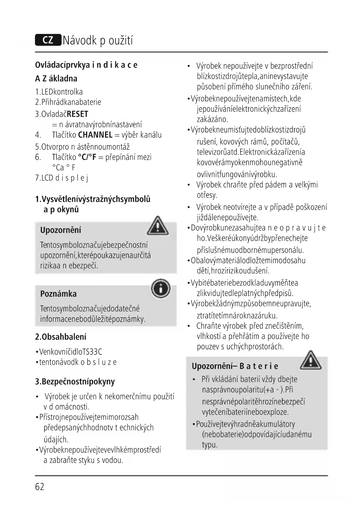 - Chraňte výrobek před znečištěním, vlhkostí apřehřátím apoužívejte ho pouze vsuchých prostorách. Upozornění –Baterie