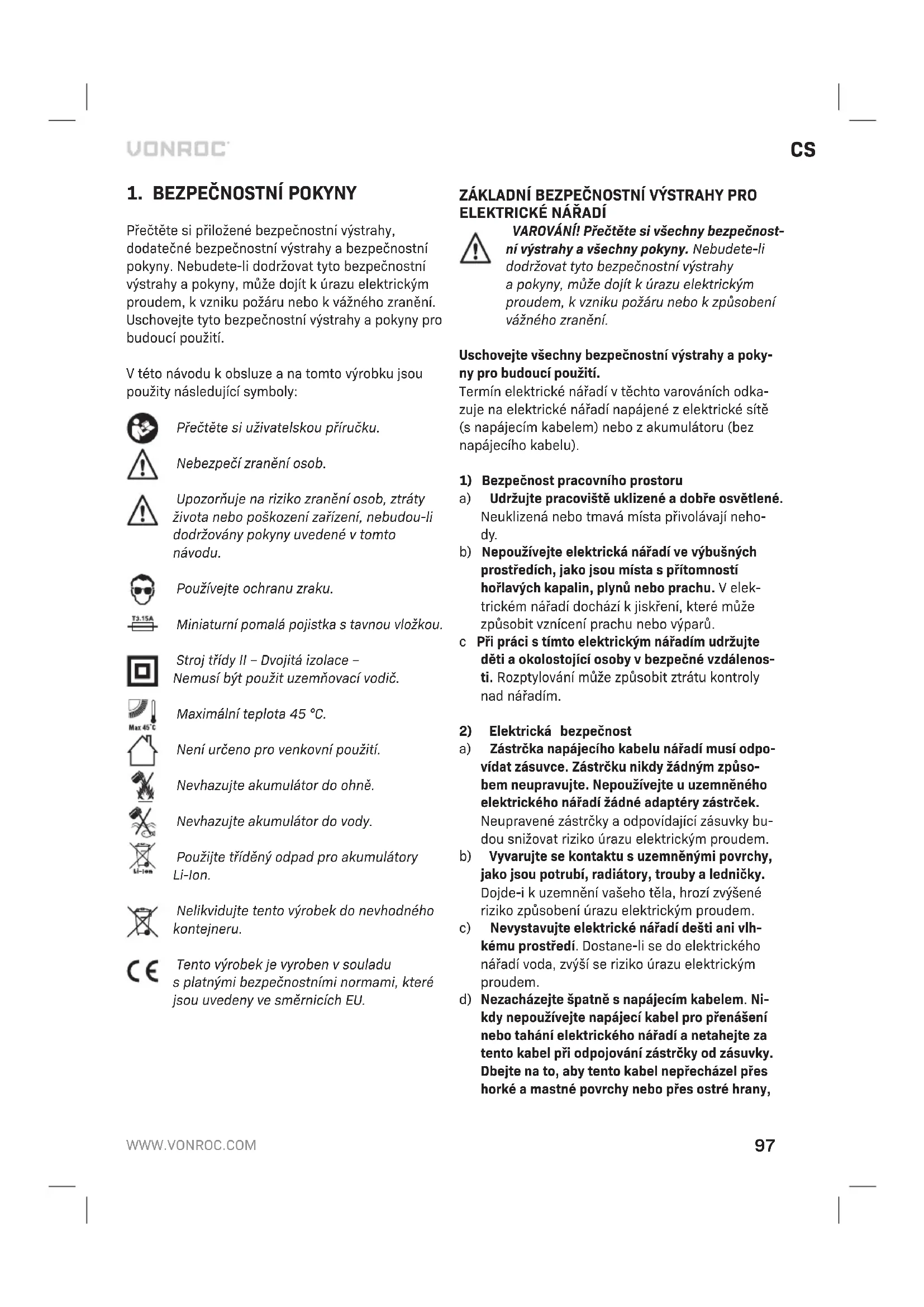 d) Používejte tento akumulátor výhradně svaším výrobkem značky Vonroc. Toto opatření samo osobě chrání akumulátor před nebezpečným přetížením. e) Akumulátor může být poškozen ostrými před- měty, jako například hřebíky nebo šroubováky, nebo vnější silou. Může dojít kvnitřnímu zkratu avznícení, vzniku kouře, výbuchu nebo přehřátí akumulátoru. BEZPEČNOSTNÍ VAROVÁNÍ PRO NABÍJEČKU Použití vsouladu surčením Touto nabíječkou nabíjejte výhradně akumulátorové moduly typu CD801AA aCD803AA. Ostatní typy akumulátorů mohou prasknout azpůsobit zranění apoškození. a) Tento výrobek není určen kpoužití osobami (včetně dětí) se sníženými fyzickými, smys- lovými nebo duševními schopnostmi, nebo snedostatkem zkušeností aznalostí, pokud jim nebyl stanoven dohled nebo pokud jim nebyly poskytnuty potřebné instrukce. b) Děti musí být pod dozorem, aby si stímto zaří- zením nehrály. c) Nenabíjejte baterie, které nejsou knabíjení určeny! d) Během nabíjení musí být akumulátory umístěny na dobře větraném místě! Elektrická bezpečnost Vždy zkontrolujte, zda se napájecí napětí sítě shoduje snapájecím napětím na výkonovém štítku.