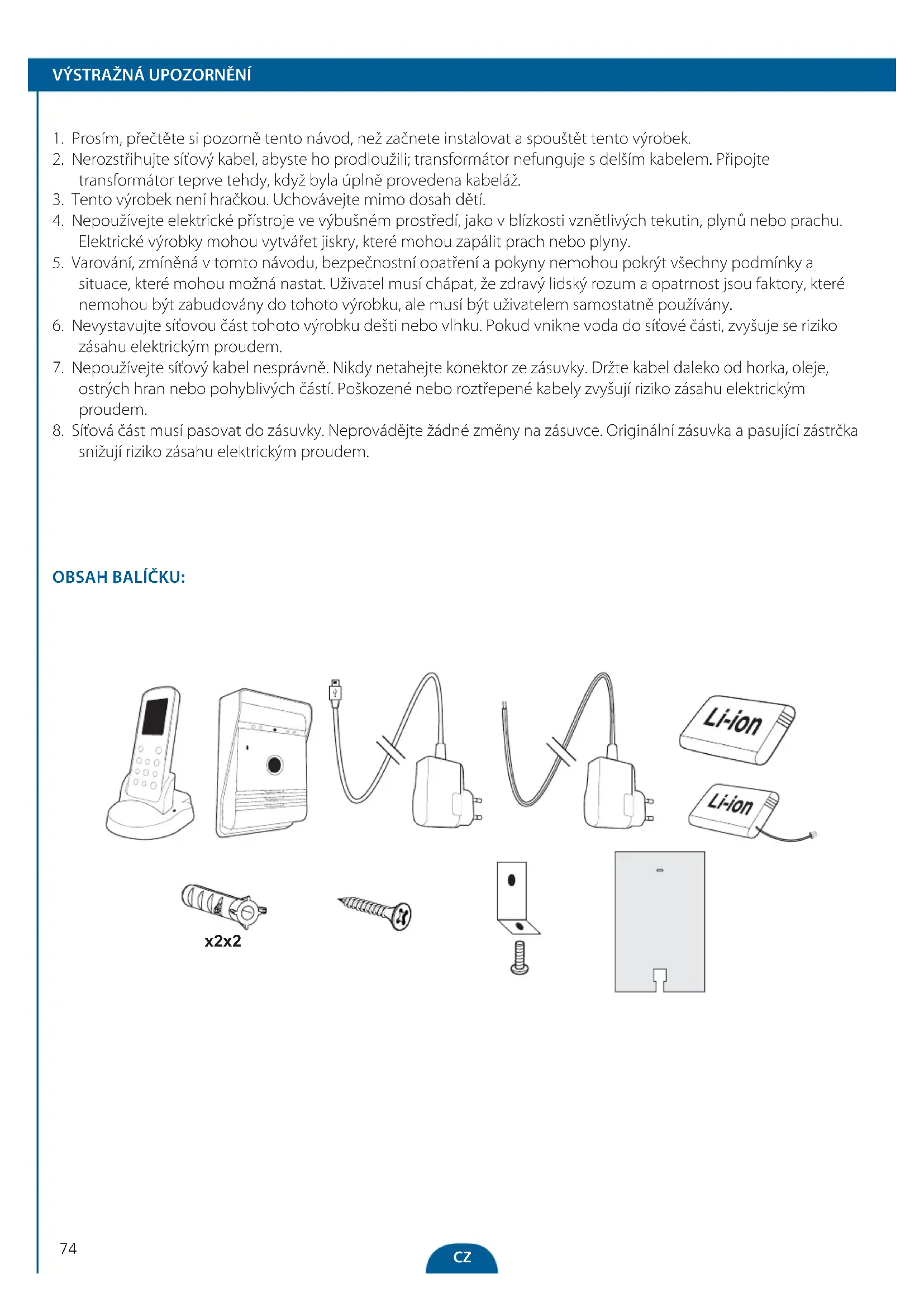 Pouze dospělí mohou vyměňovat a instalovat baterie. Odstraňte použité baterie z tohoto přístroje. Nelikvidujte baterie v ohni, mohou explodovat nebo vytéct. Nespojujte nakrátko Používejte v tomto výrobku VÝLUČNĚ dodávané nabíjecí akumulační baterie nebo identické modely. Nenechávejte tento výrobek přímo v kontaktu se zdroji horka nebo na otevřeném plamenu. Nedovolte kontakt vody s baterií nebo kabely. Instalujte opatrně, abyste předešli škodám na baterii. Během instalace baterie v pouzdře nastavte správně polaritu (+) / (-). Používejte pouze doporučené baterie. Odstraňte baterie, pokud byl přístroj po dlouhou dobu nepoužívaný. Uchovávejte přístroj ve vzdálenosti od malých dětí. Uchovávejte nepoužité baterie v originálním balení. Na konci životnosti musí být tento výrobek dopraven do znehodnocovacího zařízení8384 x2 x2