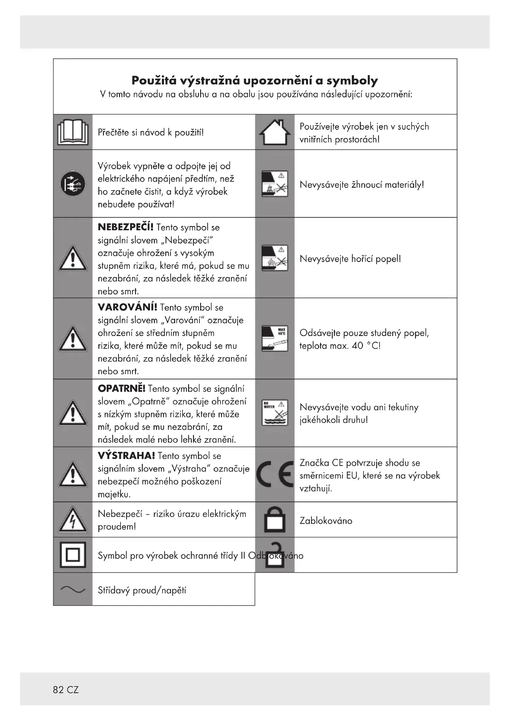 Úvod Blahopřejeme Vám ke koupi nového výrobku. Rozhodli jste se pro kvalitní produkt. Návod k obsluze je součástí tohoto výrobku. Obsahuje důležité pokyny pro bezpečnost, použití a likvidaci. Před použitím výrobku se seznamte se všemi pokyny k obsluze a bezpečnostními pokyny. Používejte výrobek jen popsaným způsobem a na uvedených místech. Při předání výrobku třetí osobě předejte i všechny podklady. Použití v souladu s určením Výrobek je určen k odstraňování studeného popela při teplotě nepřesahující 40°C a jiných chladných malých částic z komínů, kamen na dřevěné uhlí, popelnic nebo grilovacích roštů.