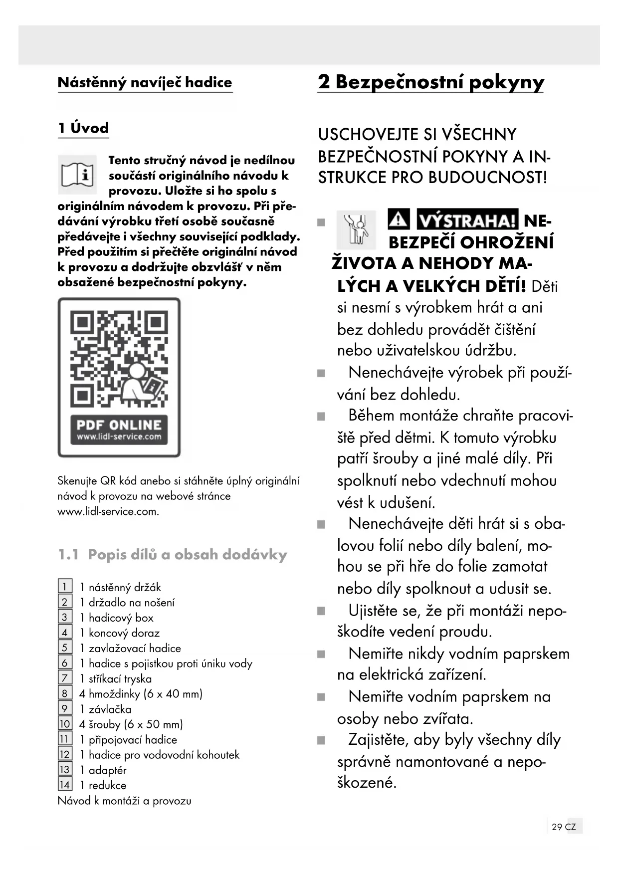 na ścianie, aby zaoszczędzić miejsce (patrz rys. B).29 CZ Nástěnný navíječ hadice 1 Úvod Tento stručný návod je nedílnou součástí originálního návodu k provozu. Uložte si ho spolu s originálním návodem k provozu. Při pře- dávání výrobku třetí osobě současně předávejte i všechny související podklady. Před použitím si přečtěte originální návod k provozu a dodržujte obzvlášť v něm obsažené bezpečnostní pokyny. Skenujte QR kód anebo si stáhněte úplný originální návod k provozu na webové stránce www.lidl-service.com.