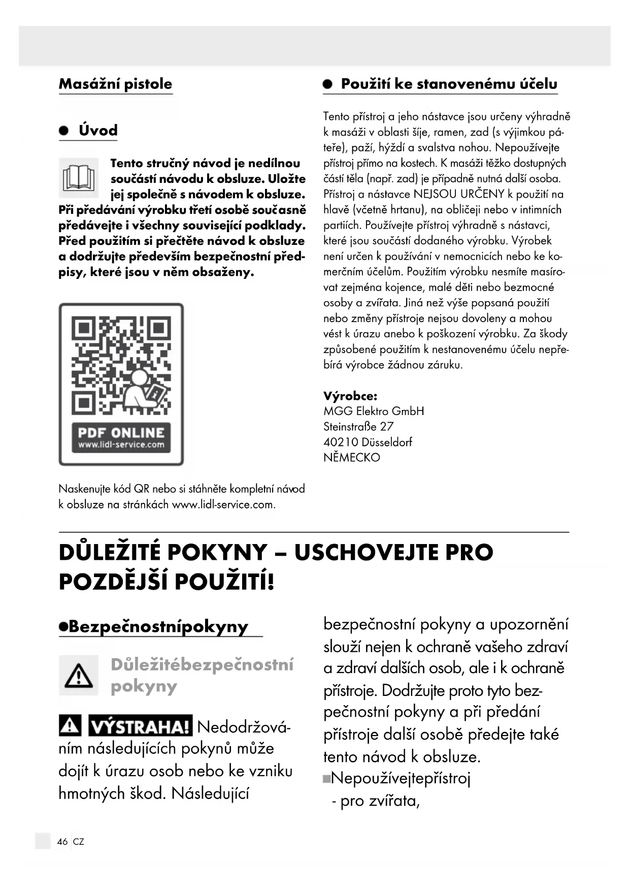 na pozycję „OFF“. Urządzenie jest całkowicie wyłączone. Wskazówka: jeśli urządzenie zatrzymuje się podczas pracy, może to być spowodowane zbyt mocnym dociskaniem. Dlatego należy uważać, aby nie dociskać zbyt mocno urzą- dzenia podczas użytkowania.45 CZ Úvod .................................................................................................................................................Strana 46 Použití ke stanovenému účelu ...................................................................................Strana 46 Bezpečnostní pokyny ........................................................................................................Strana 46 Důležité bezpečnostní pokyny ........................................................................................................ Strana 46 Bezpečnostní pokyny pro akumulátory ..........................................................................................Strana 49 Před uvedením do provozu..........................................................................................Strana 49 Nabíjení přístroje .............................................................................................................................Strana 49 Uvedení do provozu ...........................................................................................................Strana 50 Obecné informace opoužití ...........................................................................................................Strana 50 Výběr / výměna nástavce ................................................................................................................ Strana 50 Příklady použití .................................................................................................................................Strana 50 Zapnutí / vypnutí přístroje, nastavení stupně intenzity masáže ..................................................... Strana 5146 CZ Bezpečnostní pokyny Důležité bezpečnostní pokyny Nedodržová- ním následujících pokynů může dojít kúrazu osob nebo ke vzniku hmotných škod. Následující bezpečnostní pokyny a upozornění slouží nejen kochraně vašeho zdraví a zdraví dalších osob, ale i kochraně přístroje. Dodržujte proto tyto bez- pečnostní pokyny a při předání přístroje další osobě předejte také tento návod kobsluze. Nepoužívejte přístroj - pro zvířata, Masážní pistole Úvod Tento stručný návod je nedílnou součástí návodu kobsluze. Uložte jej společně snávodem kobsluze. Při předávání výrobku třetí osobě souč asně předávejte i všechny související podklady. Před použitím si přečtěte návod kobsluze a dodržujte především bezpečnostní před- pisy, které jsou vněm obsaženy. Naskenujte kód QR nebo si stáhněte kompletní náv