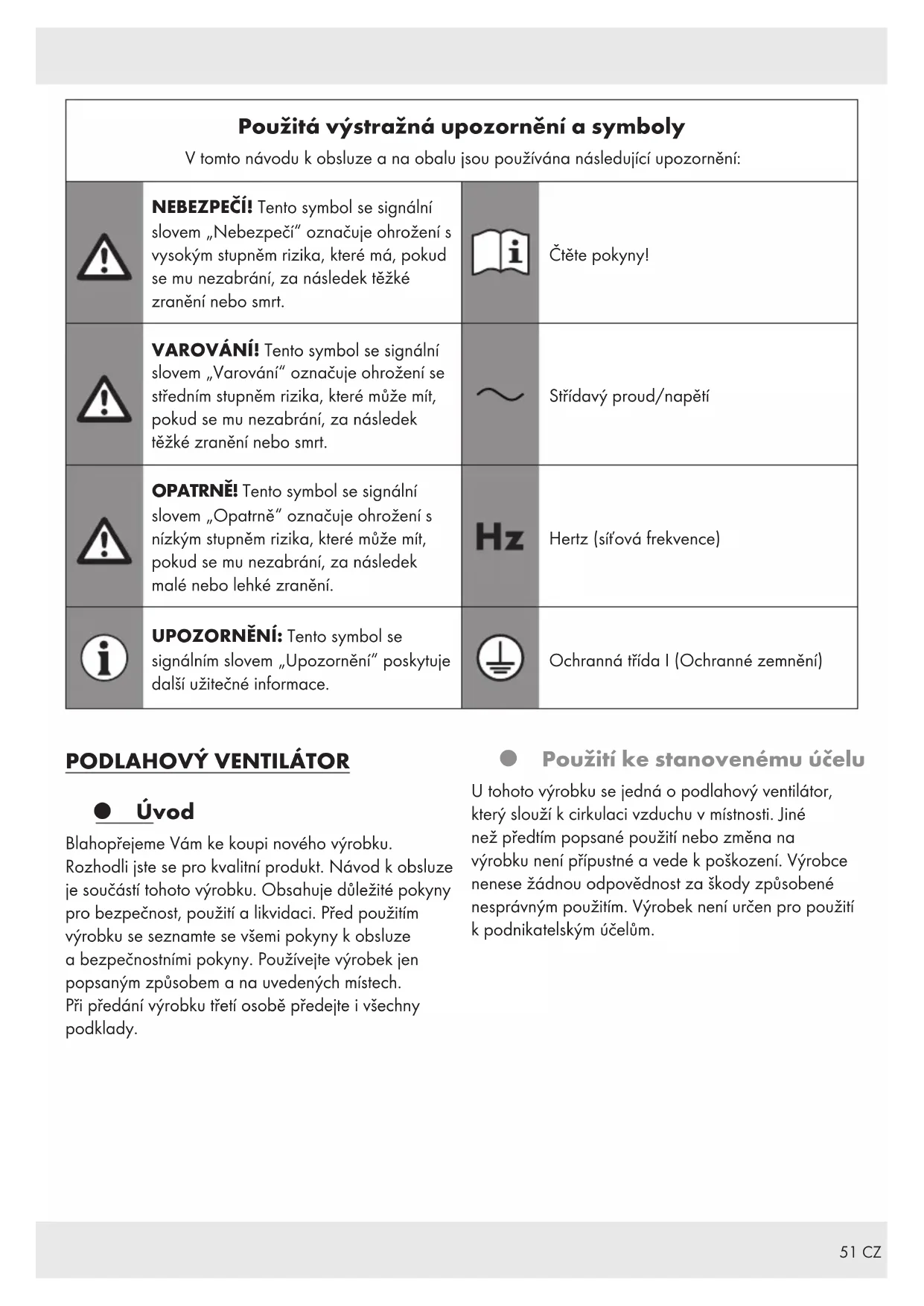 Úvod Blahopřejeme Vám ke koupi nového výrobku. Rozhodli jste se pro kvalitní produkt. Návod k obsluze je součástí tohoto výrobku. Obsahuje důležité pokyny pro bezpečnost, použití a likvidaci. Před použitím výrobku se seznamte se všemi pokyny k obsluze a bezpečnostními pokyny. Používejte výrobek jen popsaným způsobem a na uvedených místech. Při předání výrobku třetí osobě předejte i všechny podklady. Použití ke stanovenému účelu U tohoto výrobku se jedná o podlahový ventilátor, který slouží k cirkulaci vzduchu v místnosti. Jiné než předtím popsané použití nebo změna na výrobku není přípustné a vede k poškození. Výrobce nenese žádnou odpovědnost za škody způsobené nesprávným použitím. Výrobek není určen pro použití k podnikatelským účelům.52 CZ Rozsah dodávky Po vybalení produktu zkontrolujte, zda je dodávka kompletní a všechny díly jsou v řádném stavu. Před použitím odstraňte všechny obalové materiály. 1 Podlahový ventilátor 1 Návod k obsluze Popis dílů