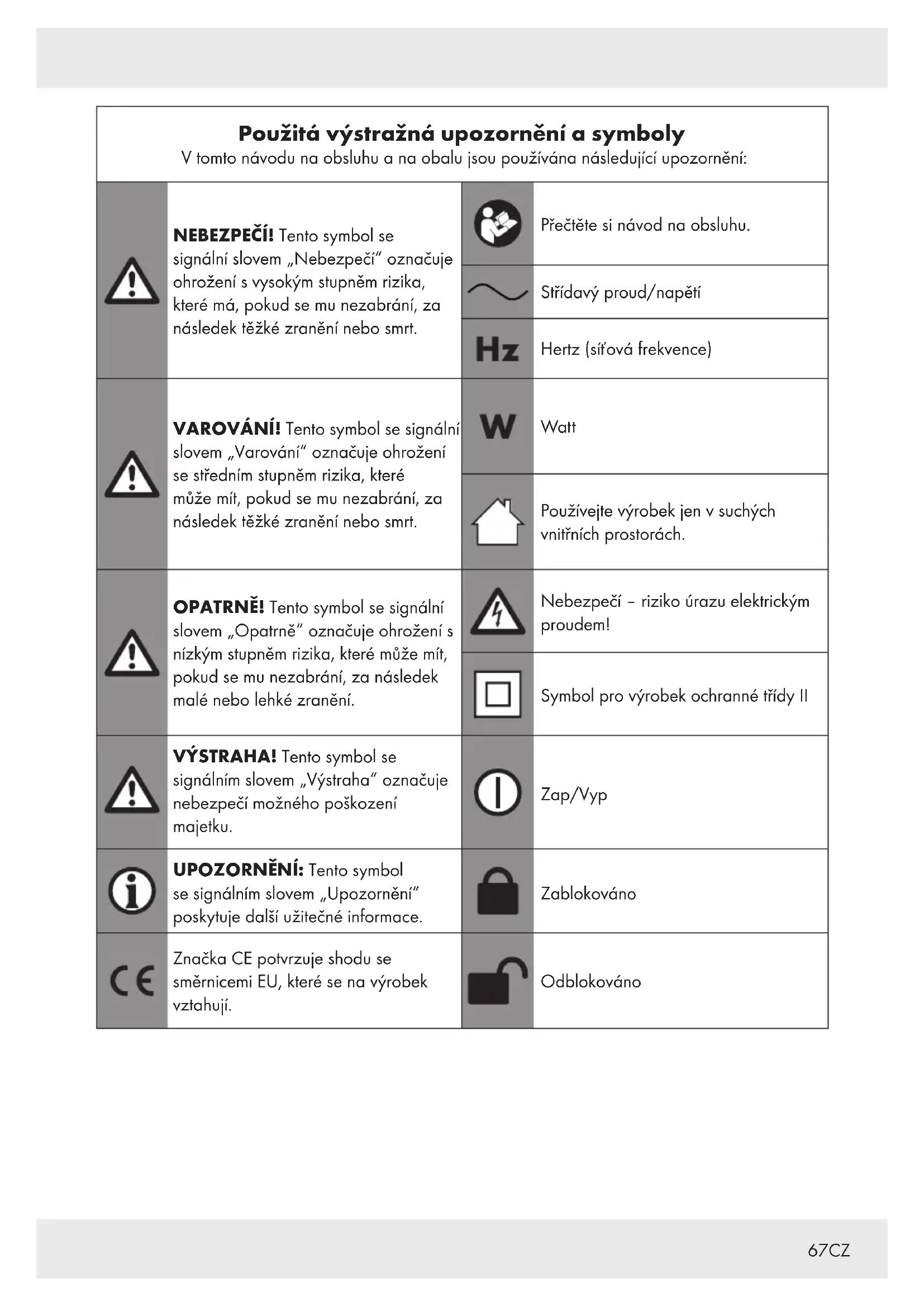 Čistěte výrobek, kryt filtru [] a HEPA filtr [] (viz „Čištění a péče“).76 CZ Skladování Pokud není výrobek používán, skladujte ho v originálním obalu. Předtím, než budete výrobek ukládat, ho vyčistěte. Uchovávejte výrobek a suchém místě mimo dosah dětí. Zlikvidování Obal se skládá z ekologických materiálů, které můžete zlikvidovat prostřednictvím místních sběren recyklovatelných materiálů. Výrobek a obalové materiály jsou recyklovatelné a podléhají rozšířené odpovědnosti výrobce. Pro lepší zpracování odpadu jej likvidujte odděleně podle vyobrazených symbolů na obalu. Logo Triman platí jen pro Francii. Při třídění odpadu se řiďte podle označení obalových materiálů zkratkami (a) a čísly (b), s následujícím významem: 1–7: umělé hmoty / 20–22: papír a lepenka / 80–98: složené látky. O možnostech likvidace vysloužilých zařízení se informujte u správy vaší obce nebo města. V zájmu ochrany životního prostředí vysloužilý výrobek nevyhazujte do domovního odpadu, ale předejte k odborné likvidaci. O sběrnách a jejich otevíracích hodinách se můžete informovat u příslušné správy města nebo obce.77CZ Záruka Výrobek byl vyroben s nejvyšší pečlivostí podle přísných kvalitativních směrnic a před odesláním prošel výstupní kontrolou. V případě závad máte možnost uplatnění zákonných práv vůči prodejci. Vaše práva ze zákona nejsou omezena naší níže uvedenou zárukou. Na tento artikl platí 3 záruka od data zakoupení. Záruční lhůta začíná od data zakoupení. Uschovejte si dobře originál pokladní stvrzenky. Tuto stvrzenku budete potřebovat jako doklad o zakoupení. Pokud se do 3 let od data zakoupení tohoto výrobku vyskytne vada materiálu nebo výrobní vada, výrobek Vám – dle našeho rozhodnutí – bezplatně opravíme nebo vyměníme. Tato záruka zaniká, jestliže se výrobek poškodí, neodborně použil nebo neobdržel pravidelnou údržbu. Záruka platí na vady materiálu a výrobní vady. Tato záruka se nevztahuje na díly výrobku podléhající opotřebení (např. na baterie), dále na poškození křehkých, choulostivých dílů, např. vypínačů, akumulátorů nebo dílů zhotovených ze skla. Postup v případě uplatňování záruky Pro zajištění rychlého zpracování Vašeho případu se řiďte následujícími pokyny: Pro všechny požadavky si připravte pokladní stvrzenku a číslo artiklu (IAN 391617_2201) jako doklad o zakoupení. Číslo artiklu najdete na typovém štítku, gravuře, titulní stránce návodu (vlevo dole) nebo na nálepce na zadní nebo spodní straně. V případě poruch funkce nebo jiných závad nejdříve kontaktujte, telefonicky nebo e-mailem, v následujícím textu uvedené servisní oddělení. Výrobek registrovaný jako vadný potom můžete s přiloženým dokladem o zakoupení (pokladní stvrzenkou) a údaji k závadě a kdy k ní došlo, bezplatně zaslat na adresu servisu, která Vám byla sdělena. Servis Servis Česká republika Tel.: 800600632 E-Mail: owim@lidl.cz78 SK Použité výstražné upozornenia a symboly .....................Strana 79 Úvod..................................................................Strana 80 Používanie v súlade s určením .............................................Strana 80 Rozsah dodávky........................................................Strana 80 Popis súčiastok .........................................................Strana 80 Technické údaje . . . . . . . . . . . . . . . . . . . . . . . . . . . . . . . . . . . . . . . . . . . . . . . . . . . . . . . .Strana 80 Bezpečnostné upozornenia .......................................Strana 81 Pred prvým použitím...............................................Strana 84 Obsluha ..............................................................Strana 85 Príslušenstvo ...........................................................Strana 85 Inštalácia príslušenstva...................................................Strana 85 Zapnutie/vypnutie ......................................................Strana 85 Vyprázdnenie nádoby na prach ...........................................Strana 85 Čistenie a starostlivosť.............................................Strana 86 Odstránenie porúch ................................................Strana 87 Skladovanie.........................................................Strana 88 Likvidácia............................................................Strana 88 Záruka ...............................................................Strana 89 Postup v prípade poškodenia v záruke ......................................Strana 89 Servis.................................................................Strana 8979SK Použité výstražné upozornenia a symboly V tejto príručke a na obale sa používajú nasledujúce upozornenia: NEBEZPEČENSTVO! Tento symbol so signálnym slovom „Nebezpečenstvo“ označuje nebezpečenstvo s vysokým stupňom rizika, ktoré, ak sa mu nevyhnete, bude mať za následok smrť alebo vážne zranenie. Prečítajte si návod na používanie. Striedavý prúd/striedavé napätie Hertz (sieťová frekvencia) VÝSTRAHA! Tento symbol so signálnym slovom „Výstraha“ označuje nebezpečenstvo so stredným stupňom rizika, ktoré, ak sa mu nevyhnete, bude mať za následok vážne zranenie alebo smrť. Watt Produkt používajte len v suchých interiéroch. POZOR! Tento symbol so signálnym slovom „Pozor“ označuje nebezpečenstvo s nízkym stupňom rizika, ktoré, ak sa mu nevyhnete, bude mať za následok ľahké alebo stredne ťažké zranenie. Nebezpečenstvo úrazu elektrickým prúdom! Symbol pre produkt s triedou ochrany II OPATRNE! Tento symbol so signálnym slovom „Opatrne“ označuje možné poškodenie majetku. Zapnúť/vypnúť UPOZORNENIE: Tento symbol so signálnym slovom „Up