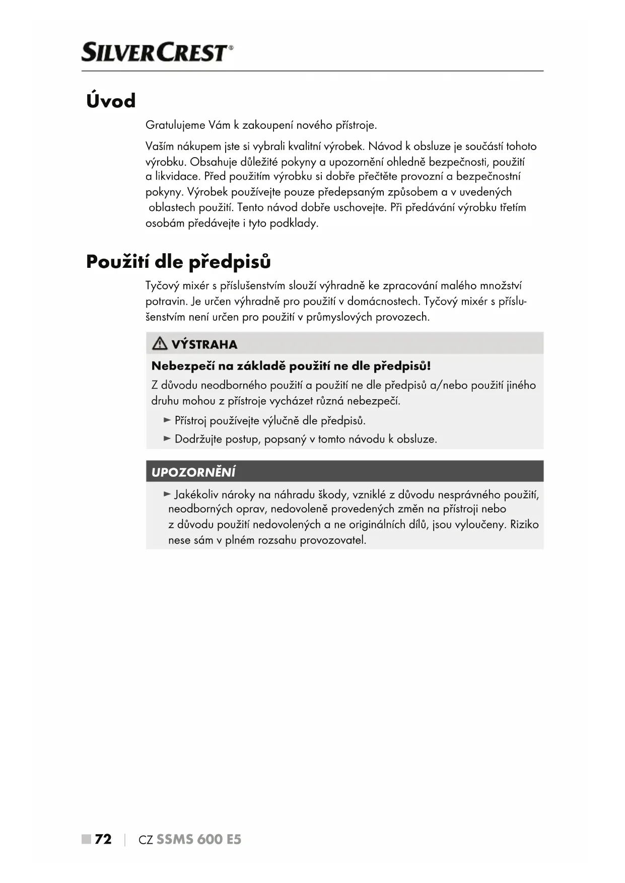Úvod Gratulujeme Vám k zakoupení nového přístroje. Vaším nákupem jste si vybrali kvalitní výrobek. Návod k obsluze je součástí tohoto výrobku. Obsahuje důležité pokyny a upozornění ohledně bezpečnosti, použití alikvidace. Před použitím výrobku si dobře přečtěte provozní a bezpečnostní pokyny. Výrobek používejte pouze předepsaným způsobem a v uvedených oblastech použití. Tento návod dobře uschovejte. Při předávání výrobku třetím osobám předávejte i tyto podklady. Použití dle předpisů Tyčový mixér s příslušenstvím slouží výhradně ke zpracování malého množství potravin. Je určen výhradně pro použití v domácnostech. Tyčový mixér s příslu- šenstvím není určen pro použití v průmyslových provozech. VÝSTRAHA Nebezpečí na základě použití ne dle předpisů! Z důvodu neodborného použití a použití ne dle předpisů a/nebo použití jiného druhu mohou z přístroje vycházet různá nebezpečí. ► Přístroj používejte výlučně dle předpisů. ► Dodržujte postup, popsaný v tomto návodu k obsluze. UPOZORNĚNÍ ► Jakékoliv nároky na náhradu škody, vzniklé z důvodu nesprávného použití, neodborných oprav, nedovoleně provedených změn na přístroji nebo zdůvodu použití nedovolených a ne originálních dílů, jsou vyloučeny. Riziko nese sám v plném rozsahu provozovatel.CZ