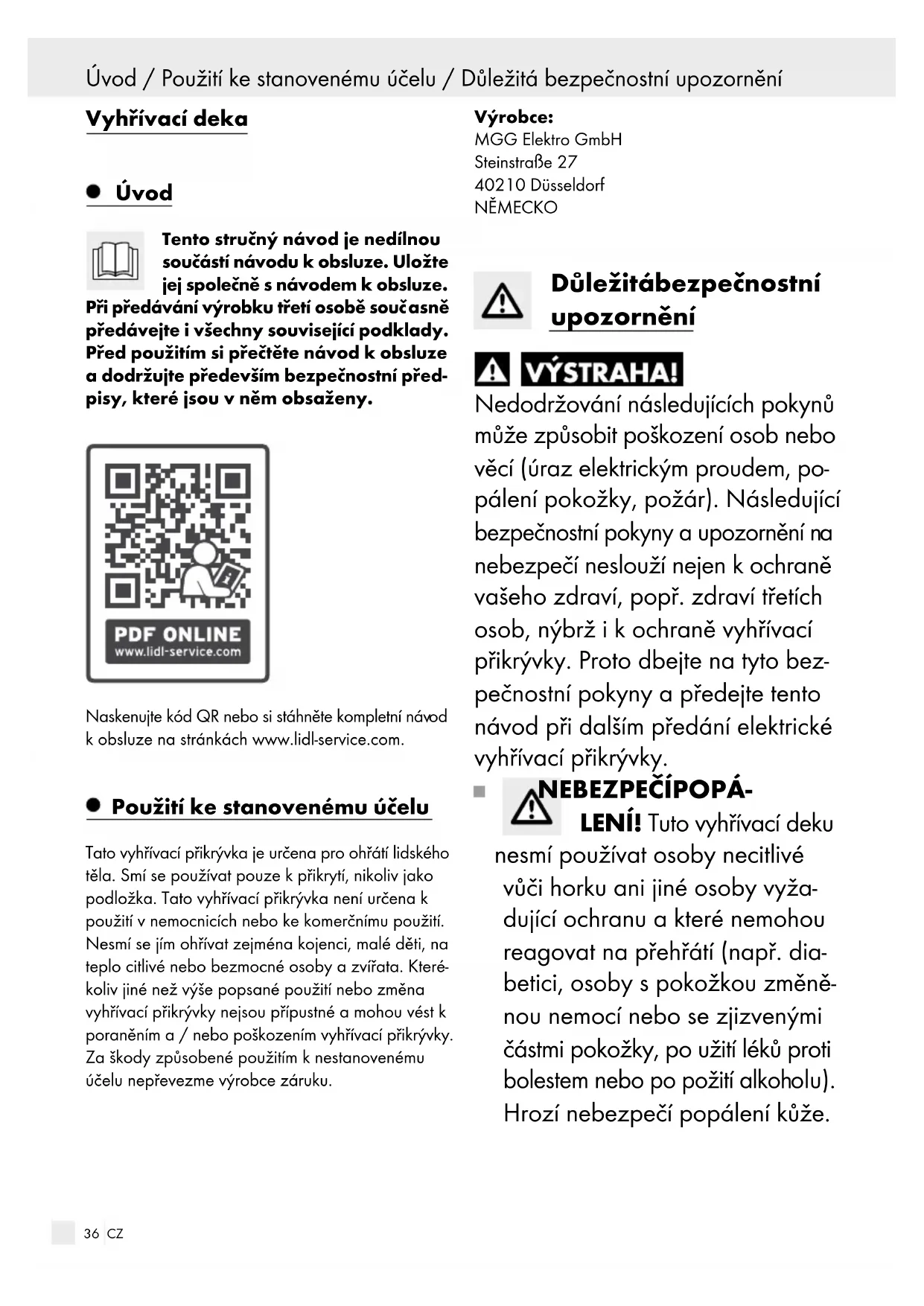 kobsluze na stránkách www.lidl-service.com. Použití ke stanovenému účelu Tato vyhřívací přikrývka je určena pro ohřátí lidského těla. Smí se používat pouze k přikrytí, nikoliv jako podložka. Tato vyhřívací přikrývka není určena k použití v nemocnicích nebo ke komerčnímu použití. Nesmí se jím ohřívat zejména kojenci, malé děti, na teplo citlivé nebo bezmocné osoby a zvířata. Které- koliv jiné než výše popsané použití nebo změna vyhřívací přikrývky nejsou přípustné a mohou vést k poraněním a / nebo poškozením vyhřívací přikrývky. Za škody způsobené použitím k nestanovenému účelu nepřevezme výrobce záruku. Výrobce: MGG Elektro GmbH Steinstraße 27 40210 Düsseldorf NĚMECKO Důležitá bezpečnostní upozornění Nedodržování následujících pokynů může způsobit poškození osob nebo věcí (úraz elektrickým proudem, po- pálení pokožky, požár). Následující bezpečnostní pokyny a upozornění n