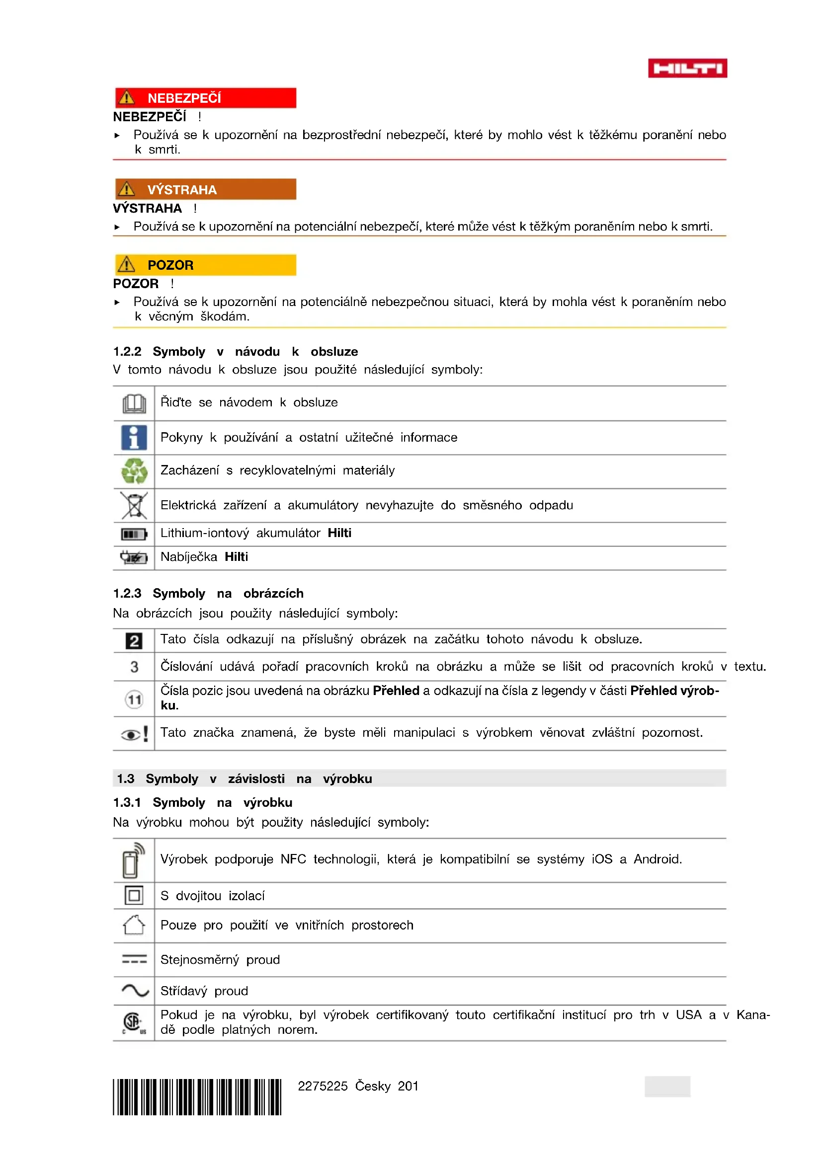 V tomto návodu k obsluze jsou použité následující symboly: Řiďte se návodem k obsluze Pokyny k používání a ostatní užitečné informace Zacházení s recyklovatelnými materiály Elektrická zařízení a akumulátory nevyhazujte do směsného odpadu Lithium-iontový akumulátor Hilti Nabíječka Hilti