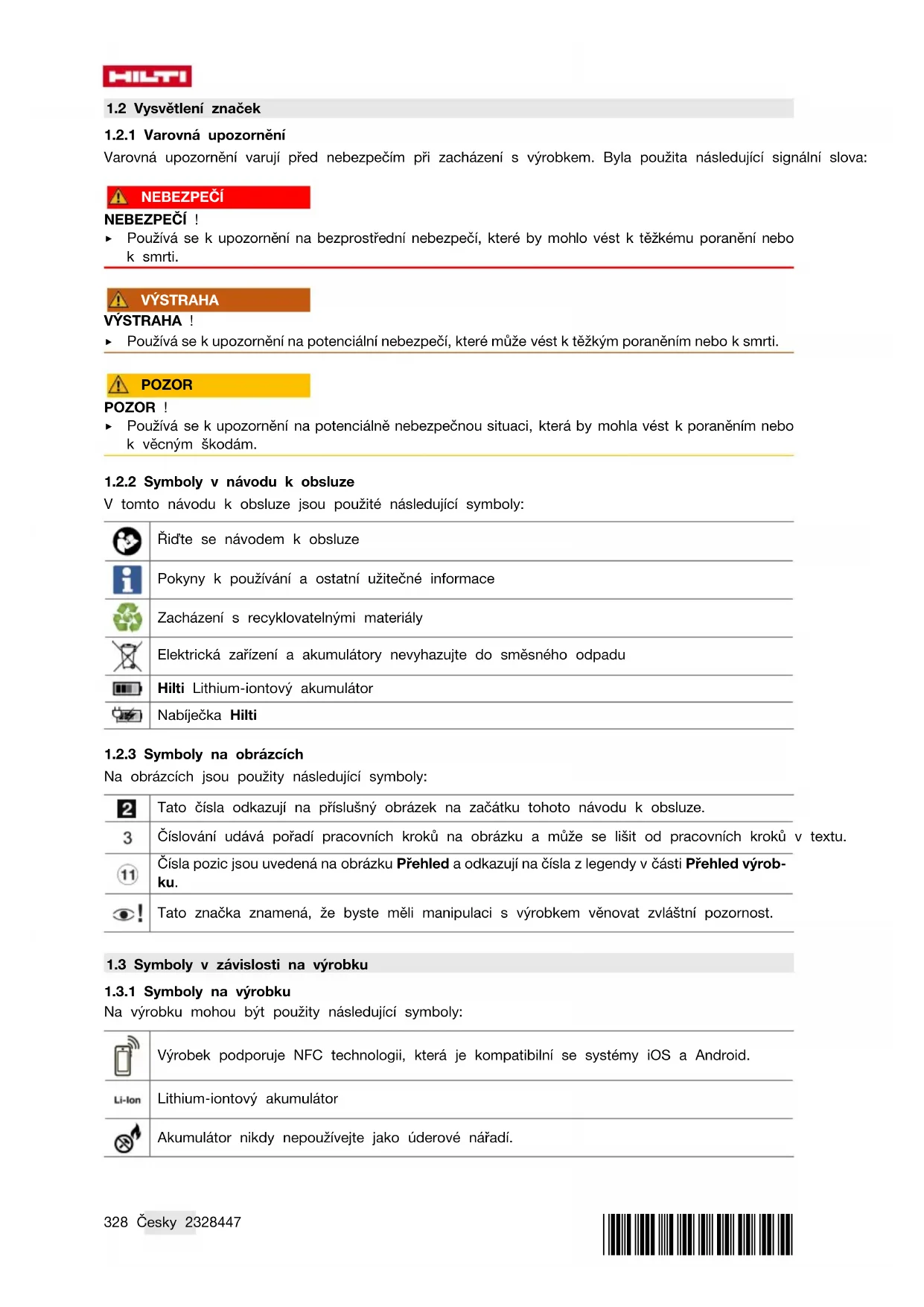 Na výrobku mohou být použity následující symboly: Výrobek podporuje NFC technologii, která je kompatibilní se systémy iOS a Android. Lithium-iontový akumulátor Akumulátor nikdy nepoužívejte jako úderové nářadí.*2328447* 2328447 Česky 329 Dbejte na to, aby akumulátor nespadl. Nepoužívejte akumulátor, který byl vystavený nárazu nebo je jinak poškozený. Použitá typová řada lithium-iontového akumulátoru Hilti. Řiďte se pokyny v kapitole Použití v souladu s určeným účelem. Pokud je na výrobku, byl výrobek certifikovaný touto certifikační institucí pro trh v USA a v Kana- dě podle platných norem.