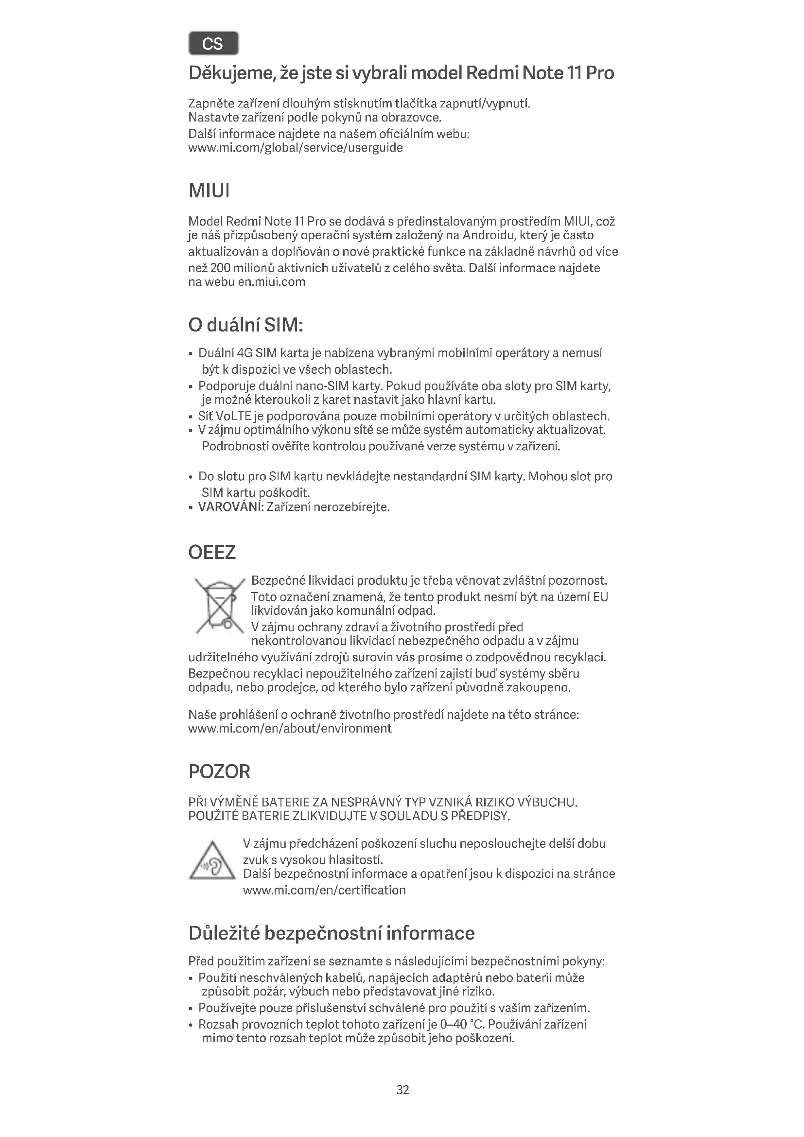 - VAROVÁNÍ: Zařízení nerozebírejte. OEEZ Bezpečné likvidaci produktu je třeba věnovat zvláštní pozornost. Toto označení znamená, že tento produkt nesmí být na území EU likvidován jako komunální odpad. V zájmu ochrany zdraví a životního prostředí před nekontrolovanou likvidací nebezpečného odpadu a v zájmu udržitelného využívání zdrojů surovin vás prosíme o zodpovědnou recyklaci. Bezpečnou recyklaci nepoužitelného zařízení zajistí buď systémy sběru odpadu, nebo prodejce, od kterého bylo zařízení původně zakoupeno. Naše prohlášení o ochraně životního prostředí najdete na této stránce: www.mi.com/en/about/environment POZOR PŘI VÝMĚNĚ BATERIE ZA NESPRÁVNÝ TYP VZNIKÁ RIZIKO VÝBUCHU. POUŽITÉ BATERIE ZLIKVIDUJTE V SOULADU S PŘEDPISY. V zájmu předcházení poškození sluchu neposlouchejte delší dobu zvuk s vysokou hlasitostí. Další bezpečnostní informace a opatření jsou k dispozici na stránce www.mi.com/en/certification Důležité bezpečnostní informace Před použitím zařízení se seznamte s následujícími bezpečnostními pokyny: