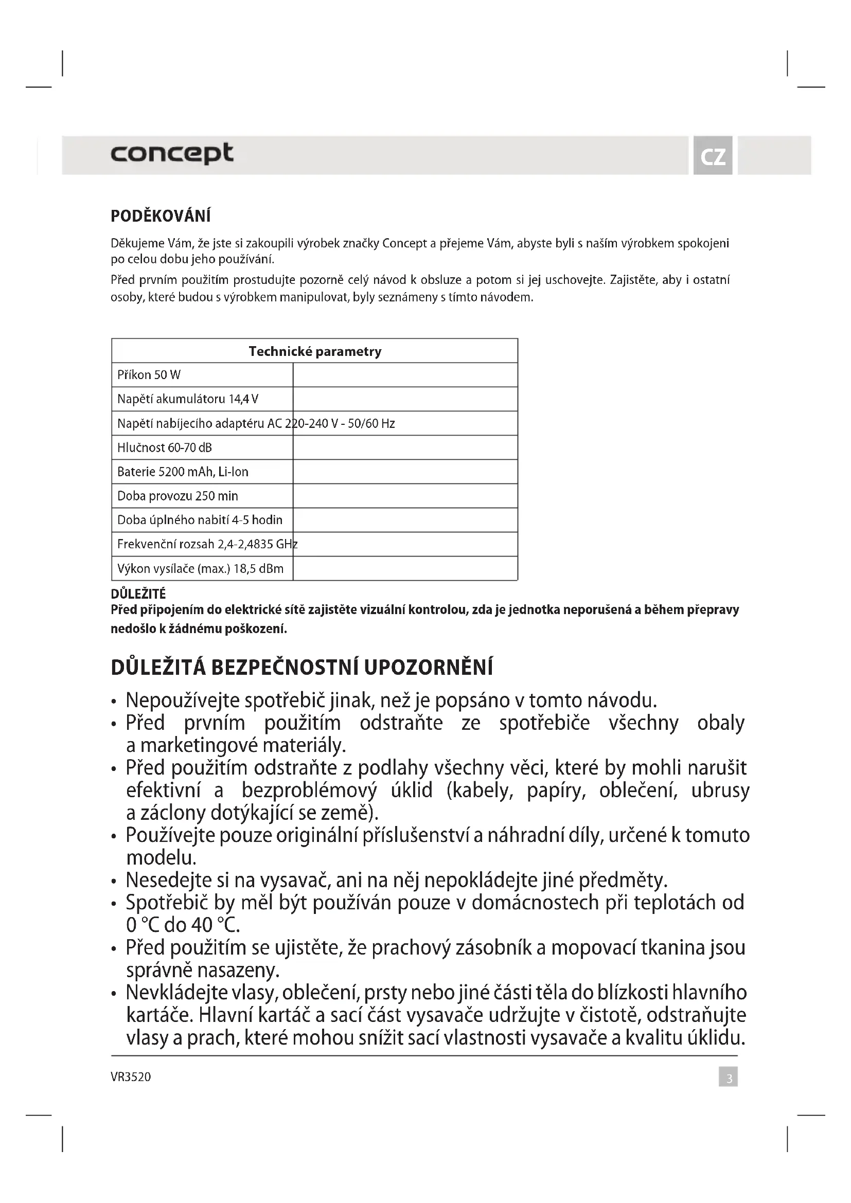 Děkujeme Vám, že jste si zakoupili výrobek značky Concept a přejeme Vám, abyste byli s naším výrobkem spokojeni po celou dobu jeho používání. Před prvním použitím prostudujte pozorně celý návod k obsluze a potom si jej uschovejte. Zajistěte, aby i ostatní osoby, které budou s výrobkem manipulovat, byly seznámeny s tímto návodem. Technické parametry Příkon 50 W Napětí akumulátoru 14,4 V Napětí nabíjecího adaptéru AC 220-240 V - 50/60 Hz Hlučnost 60-70 dB Baterie 5200 mAh, Li-Ion Doba provozu 250 min Doba úplného nabití 4-5 hodin Frekvenční rozsah 2,4-2,4835 GHz Výkon vysílače (max.) 18,5 dBm