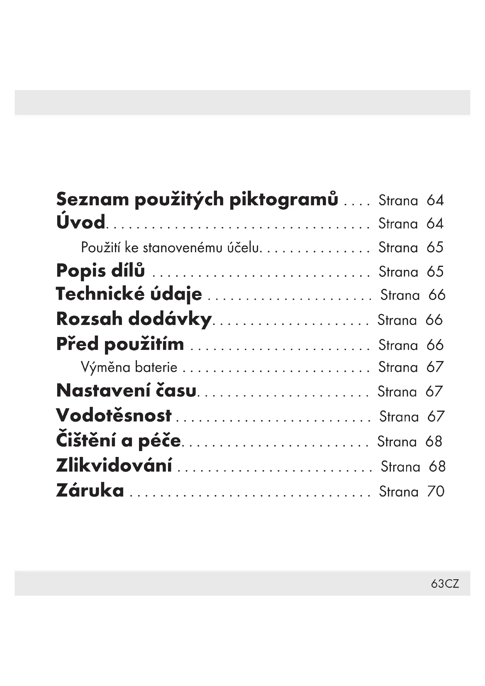 naběhne ručička sekund[3]. Vodotěsnost Tyto hodinky jsou vodotěsné do 3barů (anglicky: 3bar water resistant) testu vzdušným tlakem v souladu s normou DIN8310. ObrázekB ukazuje přípustné oblasti použití. Mějte na paměti, že vodotěsnost není trvalou vlastností. Výrobek by se měl ročně, a zejména před zvláštním zatížením, přezkoušet, neboť vestavěné těsnicí prvky ve své funkci a v denním používání ochabnou.68 CZ Čištění a péče Výrobek čistěte pouze zvnějšku čistým měkkým navlhčeným hadříkem. Podle potřeby výrobek opláchněte proudem vody. Po opláchnutí důkladně osušte. Zlikvidování Obal se skládá z ekologických materiálů, které můžete zlikvidovat prostřednictvím místních sběren recyklovatelných materiálů. Při třídění odpadu se řiďte podle označení obalových materiálů zkratkami (a) a čísly (b), s následujícím významem: 1–7: umělé hmoty / 20–22: papír a lepenka / 80–98: složené látky.69CZ Výrobek a obalové materiály jsou recyklovatelné, zlikvidujte je odděleně pro lepší odstranění odpadu. Logo Triman platí jen pro Francii. O možnostech likvidace vysloužilých zařízení se informujte u správy vaší obce nebo města. V zájmu ochrany životního prostředí vysloužilý výrobek nevyhazujte do domovního odpadu, ale předejte k odborné likvidaci. O sběrnách a jejich otevíracích hodinách se můžete informovat u příslušné správy města nebo obce. Vadné nebo vybité baterie resp. akumulátory se musí, podle směrnice 2006/66/ES a jejích příslušných změn, recyklovat. Baterie, akumulátory i výrobek odevzdejte zpět do nabízených sběren.70 CZ Ekologické škody v důsledku chybné likvidace baterií / akumulátorů! Baterie / akumulátory se nesmí zlikvidovat v domácím odpadu. Mohou obsahovat jedovaté těžké kovy a musí se zpracovávat jako zvláštní odpad. Chemické symboly těžkých kovů: Cd = kadmium, Hg = rtuť, Pb = olovo. Proto odevzdejte opotřebované baterie / akumulátory u komunální sběrny. Záruka Výrobek byl vyroben s nejvyšší pečlivostí podle přísných kvalitativních směrnic a před odesláním prošel výstupní kontrolou. V případě závad máte možnost uplatnění zákonných práv vůči prodejci. Vaše práva ze zákona nejsou omezena naší níže uvedenou zárukou.71CZ Na tento artikl platí 3 záruka od data zakoupení. Záruční lhůta začíná od data zakoupení. Uschovejte si dobře originál pokladní stvrzenky. Tuto stvrzenku budete potřebovat jako doklad o zakoupení. Pokud se do 3 let od data zakoupení tohoto výrobku vyskytne vada materiálu nebo výrobní vada, výrobek Vám – dle našeho rozhodnutí – bezplatně opravíme nebo vyměníme. Tato záruka zaniká, jestliže se výrobek poškodí, neodborně použil nebo neobdržel pravidelnou údržbu. Záruka platí na vady materiálu a výrobní vady. Tato záruka se nevztahuje na díly výrobku podléhající opotřebení (např. na baterie), dále na poškození křehkých, choulostivých dílů, např. vypínačů, akumulátorů nebo dílů zhotovených ze skla.72 CZ Ze záruky je rovněž vyloučeno snížení vodotěsnosti. Vodotěsnost není trvalou vlastností a proto se musí příslušné díly pravidelně ošetřovat. Vezměte na vědomí, že otevřením a opravou hodin nebo hodinek osobami, které k tomu nejsou oprávněny, zaniká nárok na záruku. Postup v případě uplatňování záruky Pro zajištění rychlého zpracování Vašeho případu se řiďte následujícími pokyny: Pro všechny požadavky si připravte pokladní stvrzenku a číslo artiklu (např. IAN 123456_7890) jako doklad o zakoupení. Číslo artiklu najdete na typovém štítku, gravuře, titulní stránce návodu (vlevo dole) nebo na nálepce na zadní nebo spodní straně.73CZ V případě poruch funkce nebo jiných závad nejdříve kontaktujte, telefonicky nebo e-mailem, v následujícím textu uvedené servisní oddělení. Výrobek registrovaný jako vadný potom můžete s přiloženým dokladem o zakoupení (pokladní stvrzenkou) a údaji k závadě a kdy k ní došlo, bezplatně zaslat na adresu servisu, která Vám byla sdělena. Servis Servis Česká republika Tel.: 800600632 E-Mail: owim@lidl.cz74 SK Zoznam použitých piktogramov .. Strana 75 Úvod................................... Strana 75 Použitie v súlade s určením................. Strana 76 Popis súčiastok....................... Strana 76 Technické údaje ...................... Strana 77 Rozsah dodávky..................... Strana 77 Pred použitím ........................ Strana 77 Výmena batérie ......................... Strana 78 Nastavenie času ..................... Strana 78 Vodotesnosť.......................... Strana 78 Čistenie a starostlivosť.............. Strana 79 Likvidácia............................. Strana 79 Záruka ................................ Strana 8175SK Zoznam použitých piktogramov Jednosmerný prúd/jednosmerné napätie Vhodné na použitie v daždi, pri umývaní rúk, v striekajúcej vode Vhodné na použitie pri sprchovaní, oplachovaní, kúpaní Vhodné na použitie pri plávaní, šnorchlovaní Vhodné na použitie pri windsurfingu, potápaní