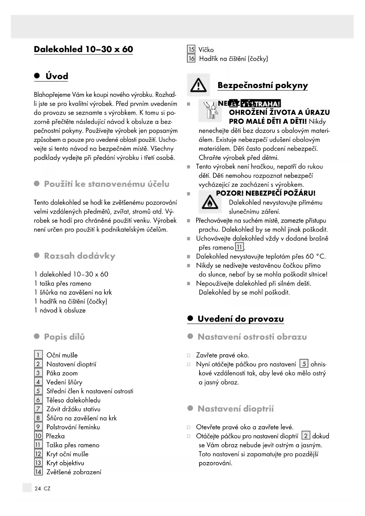 PRO MALÉ DĚTI A DĚTI! Nikdy nenechejte děti bez dozoru sobalovým materi- álem. Existuje nebezpečí udušení obalovým materiálem. Děti často podcení nebezpečí. Chraňte výrobek před dětmi. Tento výrobek není hračkou, nepatří do rukou dětí. Děti nemohou rozpoznat nebezpečí vycházející ze zacházení s výrobkem. POZOR! NEBEZPEČÍ POŽÁRU! Dalekohled nevystavujte přímému slunečnímu záření. Přechovávejte na suchém místě, zamezte přístupu prachu. Dalekohled by se mohl jinak poškodit. Uchovávejte dalekohled vždy vdodané brašně přes rameno