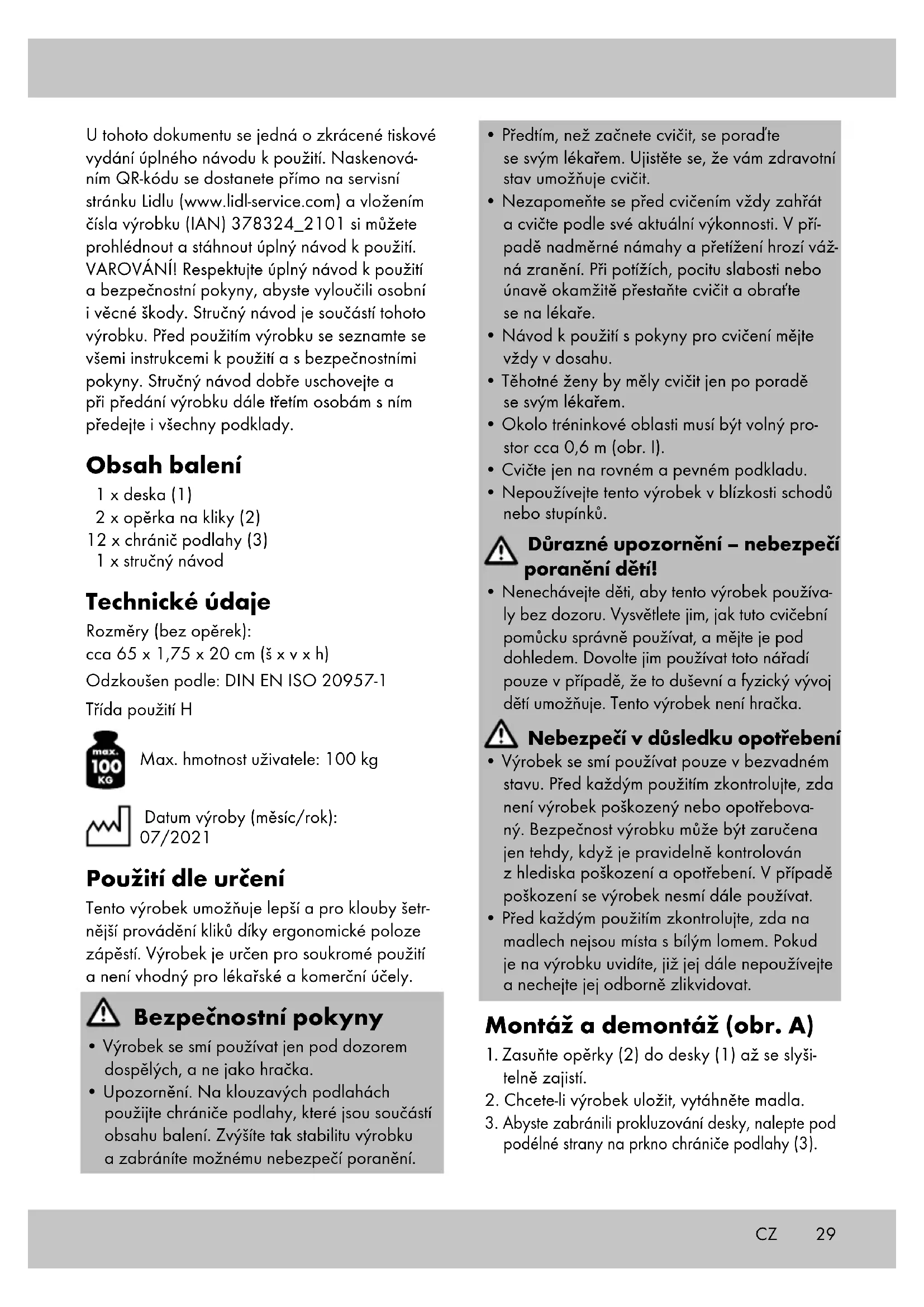 Przechowywanie, czyszczenie Podczas nieużywania należy zawsze przecho- wywać produkt w suchym i czystym miejscu, w temperaturze pokojowej. Czyścić wyłącznie wodą, a następnie wytrzeć do sucha ściereczką. WAŻNE! Nie czyścić przy użyciu ostrych środ- ków czyszczących. PL29 U tohoto dokumentu se jedná o zkrácené tiskové vydání úplného návodu k použití. Naskenová- ním QR-kódu se dostanete přímo na servisní stránku Lidlu (www.lidl-service.com) a vložením čísla výrobku (IAN) 378324_2101 si můžete prohlédnout a stáhnout úplný návod k použití. VAROVÁNÍ! Respektujte úplný návod k použití a bezpečnostní pokyny, abyste vyloučili osobní i věcné škody. Stručný návod je součástí tohoto výrobku. Před použitím výrobku se seznamte se všemi instrukcemi k použití a s bezpečnostními pokyny. Stručný návod dobře uschovejte a při předání výrobku dále třetím osobám s ním předejte i všechny podklady. Obsah balení 1 x deska (1) 2 x opěrka na kliky (2) 12 x chránič podlahy (3) 1 x stručný návod Technické údaje Rozměry (bez opěrek): cca 65 x 1,75 x 20 cm (š x v x h) Odzkoušen podle: DIN EN ISO 20957-1 Třída použití H Max. hmotnost uživatele: 100 kg Datum výroby (měsíc/rok): 07/2021 Použití dle určení Tento výrobek umožňuje lepší a pro klouby šetr- nější provádění kliků díky ergonomické poloze zápěstí. Výrobek je určen pro soukromé použití a není vhodný pro lékařské a komerční účely. Bezpečnostní pokyny
