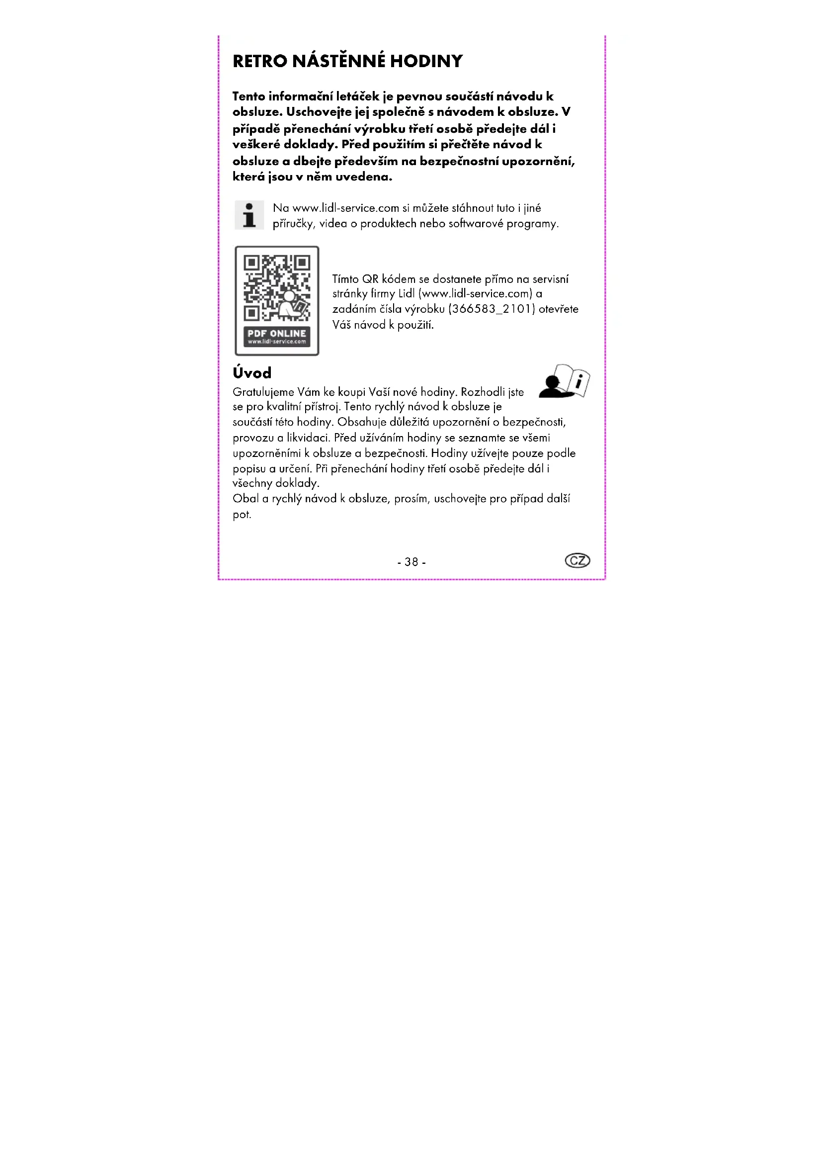 Tímto QR kódem se dostanete přímo na servisní stránky firmy Lidl (www.lidl-service.com) a zadáním čísla výrobku (366583_2101) otevřete Váš návod k použití. Úvod Gratulujeme Vám ke koupi Vaší nové hodiny. Rozhodli jste se pro kvalitní přístroj. Tento rychlý návod k obsluze je součástí této hodiny. Obsahuje důležitá upozornění o bezpečnosti, provozu a likvidaci. Před užíváním hodiny se seznamte se všemi upozorněními k obsluze a bezpečnosti. Hodiny užívejte pouze podle popisu a určení. Při přenechání hodiny třetí osobě předejte dál i všechny doklady. Obal a rychlý návod k obsluze, prosím, uschovejte pro případ další pot.- 39 - Určení užívání Hodiny je určena k použití jako ukazatel času. Jiné užití nebo úprava hodiny není v souladu s určením. Výrobce neručí za škody vzniklé nevhodným užíváním nebo špatnou obsluhou. Hodiny není určena pro průmyslové užití. Deklarace znaků
