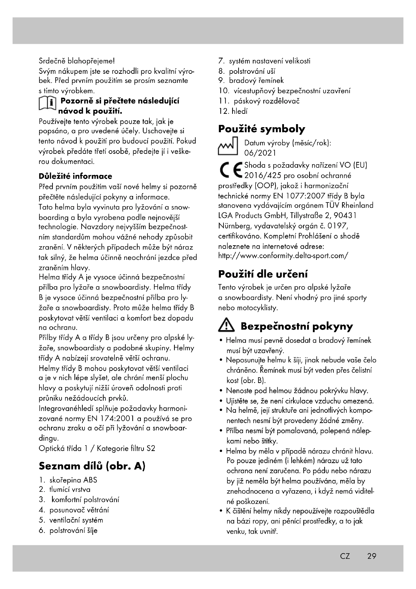 Použité symboly Datum výroby (měsíc/rok): 06/2021 Shoda s požadavky nařízení VO (EU) 2016/425 pro osobní ochranné prostředky (OOP), jakož i harmonizační technické normy EN 1077:2007 třídy B byla stanovena vydávajícím orgánem TÜV Rheinland LGA Products GmbH, Tillystraße 2, 90431 Nürnberg, vydavatelský orgán č. 0197, certifikováno. Kompletní Prohlášení o shodě naleznete na internetové adrese: http://www.conformity.delta-sport.com/ Použití dle určení Tento výrobek je určen pro alpské lyžaře a snowboardisty. Není vhodný pro jiné sporty nebo motocyklisty. Bezpečnostní pokyny