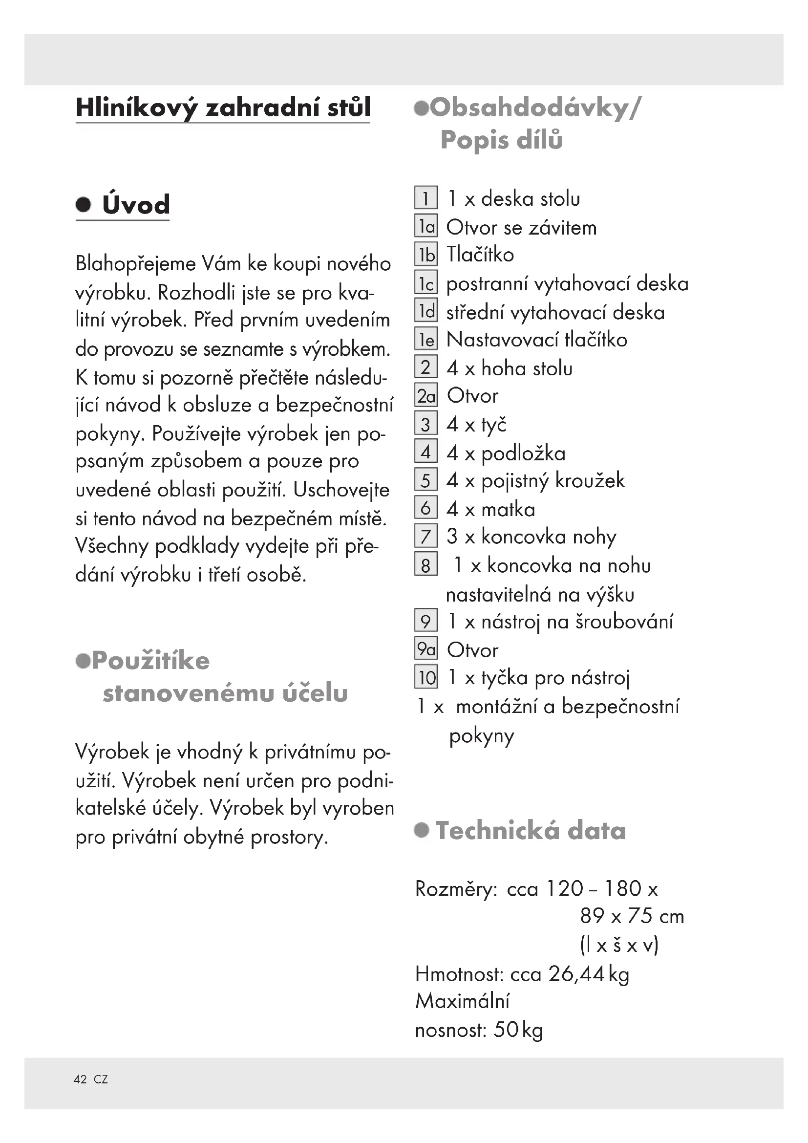 až slyšitelně zaskočí (obr. J). Čistění a ošetřování Výrobek čistěte vlhkou utěrkou a mírným čisticím prostředkem. Než výrobek opět zabalíte, nechte všechny díly důkladně uschnout. Zabráníte tím tvoření plísně, zápachů a zabarvení. Skladování Skladujte výrobek vsuché chrá- něné místnosti. Výrobek skla- dujte vždy suchý a čistý za pokojové teploty. Zlikvidování Obal se skládá zekologických materiálů, které můžete zlikvidovat prostřednictvím místních sběren recyklovatelných materiálů. O možnostech likvidace vyslouži- lých zařízení se informujte u správy vaší obce nebo města. Záruka Výrobek byl vyroben s nejvyšší peč- livostí podle přísných kvalitativních směrnic a před odesláním prošel výstupní kontrolou. V případě závad máte možnost uplatnění zákonných práv vůči prodejci. Vaše práva ze zákona nejsou omezena naší níže uvedenou zárukou. Na tento artikl platí 3 záruka od data zakoupení. Záruční lhůta46 CZ začíná od data zakoupení. Uschovejte si dobře originál pokladní stvrzenky. Tuto stvrzenku budete potřebovat jako doklad o zakoupení. Pokud se do 3 let od data zakou- pení tohoto výrobku vyskytne vada materiálu nebo výrobní vada, výro- bek Vám – dle našeho rozhodnutí – bezplatně opravíme nebo vymě- níme. Tato záruka zaniká, jestliže se výrobek poškodí, neodborně použil nebo neobdržel pravidelnou údržbu. Záruka platí na vady materiálu a výrobní vady. Tato záruka se nevzta- huje na díly výrobku podléhající opotřebení (např. na baterie), dále na poškození křehkých, choulostivých dílů, např. vypínačů, akumulátorů nebo dílů zhotovených ze skla. Postup v případě uplatňování záruky Pro zajištění rychlého zpracování Vašeho případu se řiďte následují- cími pokyny: Pro všechny požadavky si připravte pokladní stvrzenku a číslo artiklu (IAN 384027_2107 / IAN 384029_2107 / IAN 384031_2107) jako doklad o zakoupení. Číslo artiklu najdete na typovém štítku, gravuře, titulní stránce návodu (vlevo dole) nebo na nálepce na zadní nebo spodní straně. V případě poruch funkce nebo jiných závad nejdříve kontaktujte, telefonicky nebo e-mailem, v následujícím textu uvedené servisní oddělení. Výrobek registrovaný jako vadný potom můžete s přiloženým dokla- dem o zakoupení (pokladní stvr- zenkou) a údaji k závadě a kdy k ní došlo, bezplatně zaslat na adresu servisu, která Vám byla sdělena. Servis Servis Česká republika Tel.: 800600632 E-Mail: owim@lidl.cz47 SK Úvod ............................................................................................Strana 48 Používanie v súlade s určeným účelom ..................................... Strana 48 Obsah dodávky / Popis častí ..................................................... Strana 48 Technické údaje ..........................................................................Strana 48 Bezpečnostné upozornenia ...........................................Strana 49 Montáž ......................................................................................Strana 50 Vytiahnutie stolovej dosky ..........................................................Strana 50 Čistenie a údržba .................................................................Strana 51 Skladovanie ...........................................................................Strana 51 Likvidácia .................................................................................Strana 51 Záruka .......................................................................................Strana 52 Postup v prípade poškodenia v záruke .....................................Strana 52 Servis ...........................................................................................Strana 5348 SK Hliníkový záhradný stôl Úvod Blahoželáme Vám ku kúpe Vášho nového výrobku. Kúpou ste sa roz- hodli pre vysoko kvalitný produkt. Pred prvým uvedením do prevádzky sa oboznámte s výrobkom. Za týmto účelom si pozorne prečítajte nasledujúci návod na obsluhu a bez pečnostné pokyny. Výrobok použí- vajte iba v súlade s popisom a v uvedených oblastiach používania. Tento návod uschovajte na bezpeč- nom mieste. Ak výrobok odovzdáte ďalšej osobe, priložte k nemu aj všetky podklady. Používanie v súlade s určeným účelom Výrobok je vhodný pre súkromnú oblasť. Výrobok nie je určený na komerčné účely. Výrobok bol vyro- bený pre súkromné obytné oblasti. Obsah dodávky / Popis častí