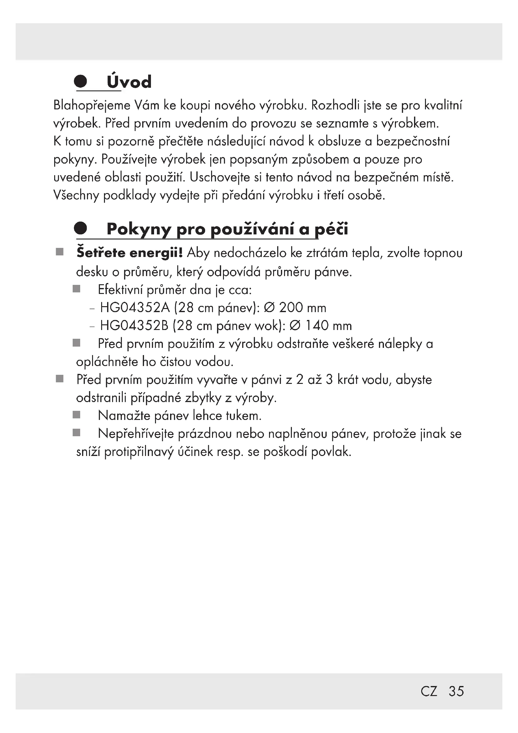 Úvod Blahopřejeme Vám ke koupi nového výrobku. Rozhodli jste se pro kvalitní výrobek. Před prvním uvedením do provozu se seznamte s výrobkem. K tomu si pozorně přečtěte následující návod k obsluze a bezpečnostní pokyny. Používejte výrobek jen popsaným způsobem a pouze pro uvedené oblasti použití. Uschovejte si tento návod na bezpečném místě. Všechny podklady vydejte při předání výrobku i třetí osobě. Pokyny pro používání a péči Šetřete energii! Aby nedocházelo ke ztrátám tepla, zvolte topnou desku o průměru, který odpovídá průměru pánve. Efektivní průměr dna je cca: – HG04352A (28cm pánev): Ø 200 mm – HG04352B (28cm pánev wok): Ø 140 mm Před prvním použitím z výrobku odstraňte veškeré nálepky a opláchněte ho čistou vodou. Před prvním použitím vyvařte v pánvi z 2až3krát vodu, abyste odstranili případné zbytky z výroby. Namažte pánev lehce tukem. Nepřehřívejte prázdnou nebo naplněnou pánev, protože jinak se sníží protipřilnavý účinek resp. se poškodí povlak.36 CZ Nebezpečí přehřátí! U tukem nenamazaných přehřátých pánví může dojít při kontaktu stuk neobsahující připravovanou potravinou ke zbarvením nepřilnavého povrchu v důsledku spalování proteinů. Tato zabarvení je třeba považovat za stopy používání, nepředstavují žádné narušení jakosti povlaku a jeho způsobilosti pro používání. Ohřívejte připravované potraviny při vyšším/středním ohřevu a nechte je pak na nízkém stupni dovařit. Nenechávejte pánev bez dozoru, když se tuk zahřívá: Přehřátý tuk se může vznítit. Nikdy nehaste hořící tuk vodou! Zaduste plameny víkem hrnce nebo hustou vlněnou dekou. Používejte pouze plastové nebo dřevěné kuchyňské pomůcky abyste nepoškodili nepřilnavý povrch. Nekrájejte potraviny přímo v pánvi. Do pánve nedávejte nikdy maso, ze kterého kape. Prostřednictvím tuku stříkajícího na žhavou plotýnku sporáku může snadno vzniknout požár. Během vaření se může zahřát rukojeť. Pro svou ochranu používejte chňapky nebo grilovací rukavice. Pánev je vhodná plynové, elektrické, sklokeramické, indukční a halogenové varné desky.37CZ Pokyn pro indukční varná pole: Za určitých okolností může nastat hluk, který je důsledkem elektromagnetických vlastností zdroje tepla a hrnce/pánve. To je normální a neznamená to závadu indukčního varného pole ani nádobí. Hrnec/pánev je třeba umístit do středu na indukční varné pole. VÝSTRAHA! Vysoká rychlost ohřevu! Kuchyňské nádobí při předehřevu nepřehřejte. V případě přehřátí musí být místnost důkladně vyvětrána. Toto zboží kombinuje výhody hliníkového nádobí, jako jsou nízká hmotnost a vysoká tepelná vodivost, s výhodami vaření s indukcí. Aby to bylo možné, byly do hliníkového dna vloženy magnetické ocelové prvky. Dno tedy není průběžně magnetické, takže se na indukčních deskách, které jsou výrazně větší než průměr dna, může stát, že indukční cívky nereagují. To není nedostatek kvality a nepředstavuje narušení funkčnosti. Aby výrobek správně fungoval, vždy jej umístěte na varné pole, které odpovídá účinnému spodnímu průměru uvedenému v této příručce. Vysoké teploty mohou vést ke změně barvy vnější strany výrobku. Nejedná se o vadu materiálu a neovlivňuje to kvalitu nebo funkci výrobku. Nikdy nedávejte horký výrobek pod tekoucí studenou vodu. Spodní část výrobku by se tím mohla poškodit nebo z výrobku odpadnout.38 CZ Výrobek je vhodný pro udržování teplých jídel v troubě (max. 160 °C po dobu 1hodiny). Tato pánev je vhodná pro mytí v myčce. Pro ruční čištění použijte horkou vodu a obyčejný prostředek na mytí nádobí. Vyhněte se používání ostrých a špičatých předmětů nebo kartáčů, abyste nepoškodili materiál. K čištění nepoužívejte žádné ostré abrazivní prostředky. Časté čištění ostrými čisticími prostředky může vést k poškození a/ nebo změně barvy pánve. Čištění v myčce může vést ke změně zbarvení hliníkových dílů. VÝSTRAHA! ŠKRÁBANCE! Vyhněte se posouvání nádobí tam a zpět na sklokeramické varných polích! Než začnete s vařením, doporučujeme, abyste otřeli povrch varného pole a dno nádobí čistou, nežmolkující látkou (například z mikrovlákna). Tímto způsobem můžete předejít poškrábání. Bezpečné pro potraviny: Tato pánev nemá žádný vliv na chuť a vůni připravovaného jídla. Jsou-li rukojeti volné, pánve nepoužívejte. Je-li to nutné, utáhněte šroubové spojení rukojetí. Zlikvidování Obal se skládá z ekologických materiálů, které můžete zlikvidovat prostřednictvím místních sběren recyklovatelných materiálů. O možnostech likvidace vysloužilých zařízení se informujte u správy vaší obce nebo města.39CZ Záruka Výrobek byl vyroben s nejvyšší pečlivostí podle přísných kvalitativních směrnic a před odesláním prošel výstupní kontrolou. V případě závad máte možnost uplatnění zákonných práv vůči prodejci. Vaše práva ze zákona nejsou omezena naší níže uvedenou zárukou. Na tento artikl platí 3 záruka od data zakoupení. Záruční lhůta začíná od data zakoupení. Uschovejte si dobře originál pokladní stvrzenky. Tuto stvrzenku budete potřebovat jako doklad o zakoupení. Pokud se do 3 let od data zakoupení tohoto výrobku vyskytne vada materiálu nebo výrobní vada, výrobek Vám – dle našeho rozhodnutí – bezplatně opravíme nebo vyměníme. Tato záruka zaniká, jestliže se výrobek poškodí, neodborně použil nebo neobdržel pravidelnou údržbu. Záruka platí na vady materiálu a výrobní vady. Tato záruka se nevztahuje na díly výrobku podléhající opotřebení (např. na baterie)