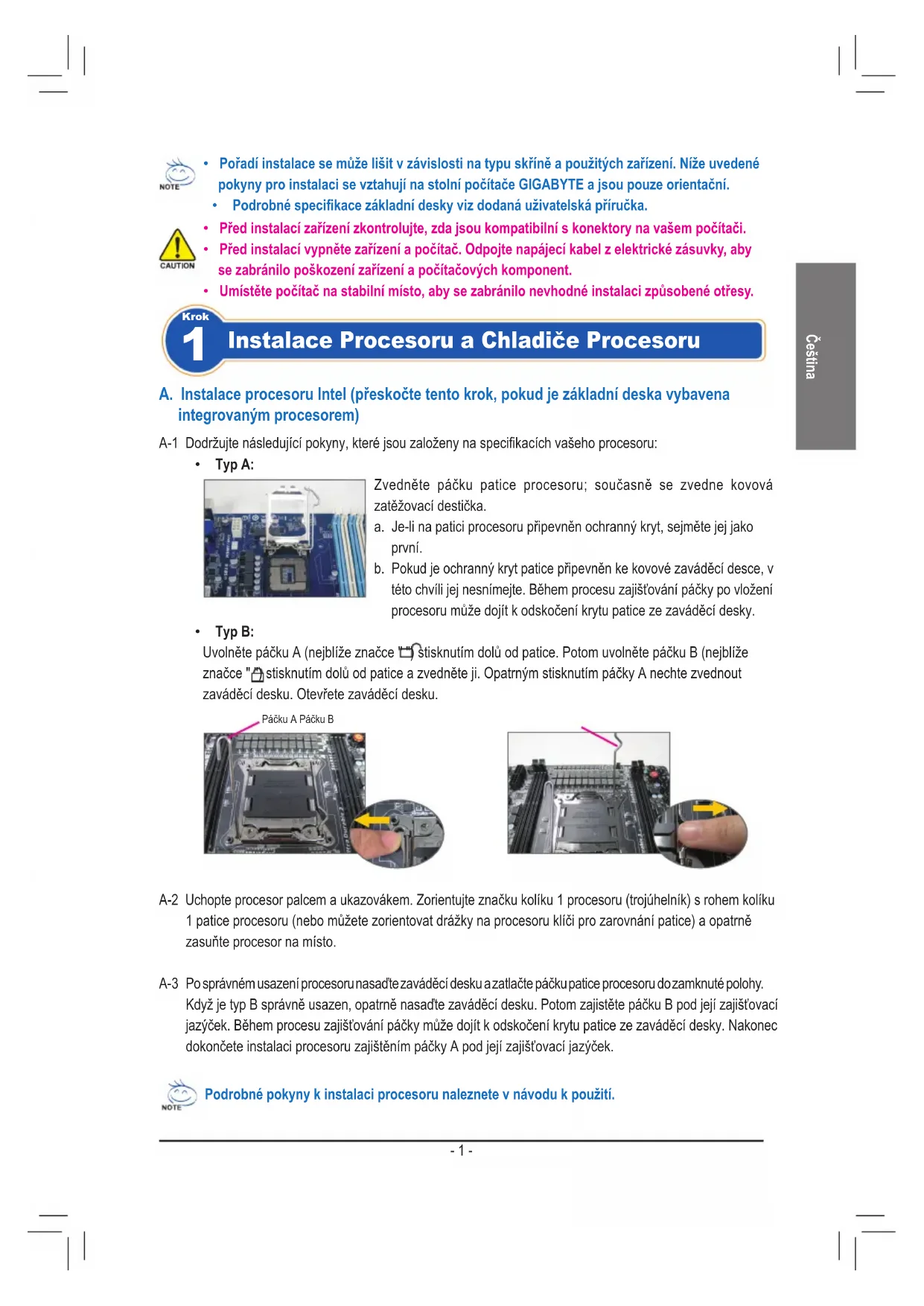 - Typ B: Uvolněte páčku A (nejblíže značce " ") stisknutím dolů od patice. Potom uvolněte páčku B (nejblíže značce " ") stisknutím dolů od patice a zvedněte ji. Opatrným stisknutím páčky A nechte zvednout zaváděcí desku. Otevřete zaváděcí desku. A-1 Dodržujte následující pokyny, které jsou založeny na specikacích vašeho procesoru: