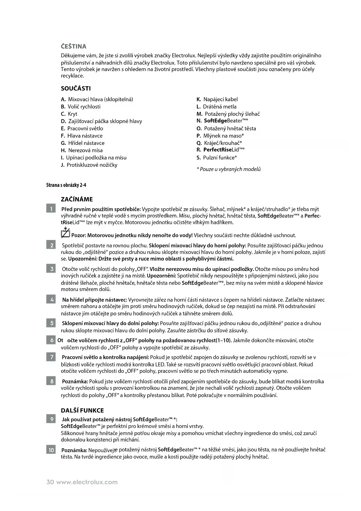 inových ručiček a zajistěte ji na místě. Upozornění: Spotřebič nikdy nespouštějte s připojenými nástavci, jako jsou drátěné šlehače, ploché hnětače, hnětače těsta nebo SoftEdgeBeater™*, bez mísy na svém místě a sklopené hlavice motoru směrem dolů. 4 Na hřídel připojte nástavec: Vyrovnejte zářez na horní části nástavce s čepem na hřídeli nástavce. Zatlačte nástavec směrem nahoru a otáčejte jím proti směru hodinových ručiček, dokud se čep nezajistí na místě. Při odstraňování nástavce jím otáčejte po směru hodinových ručiček a táhněte směrem dolů. 5 Sklopení mixovací hlavy do dolní polohy: Posuňte zajišťovací páčku jednou rukou do „odjištěné“ pozice a druhou rukou sklopte mixovací hlavu do dolní polohy. Zasuňte zástrčku do síťové zásuvky. 6 Ot očte voličem rychlosti z „OFF“ polohy na požadovanou rychlost(1–10). Jakmile dokončíte mixování, otočte voličem rychlosti do „OFF“ polohy a vypojte spotřebič ze zásuvky. 7 Pracovní světlo a kontrolka napájení: Pokud je spotřebič zapojen do zásuvky se zvolenou rychlostí, rozsvítí se v blízkosti voliče rychlosti modrá kontrolka LED. Také se rozsvítí pracovní světlo osvětlující pracovní oblast. Pokud otočíte voličem rychlosti do „OFF“ polohy, pracovní světlo se po třech minutách automaticky vypne. 8 Poznámka: Pokud jste voličem rychlosti otočili před zapojením spotřebiče do zásuvky, bude blikat modrá kontrolka voliče rychlosti spolu s provozní kontrolkou na znamení, že jste nechali volič rychlosti zapnutý. Otočte voličem rychlosti do polohy „OFF“ a kontrolky přestanou blikat. Poté pokračujte v normálním používání. DALŠÍ FUNKCE 9 Jak používat potažený nástroj SoftEdgeBeater™ *: SoftEdgeBeater™ je perfektní pro krémové směsi a horní vrstvy. Silikonové hrany hnětače jemně potřou okraje mísy a pomohou vmíchat všechny ingredience do směsi, což zaručí dokonalou konzistenci při míchání. 10 Poznámka: Nepoužívejt e potažený nástroj SoftEdgeBeater™ * na těžké směsi, jako jsou těsta, na ně používejte hnětač těsta. Na tvrdé ingredience jako ovoce, mušle a kosti použijte raději potažený plochý hnětač.31www.electrolux.com