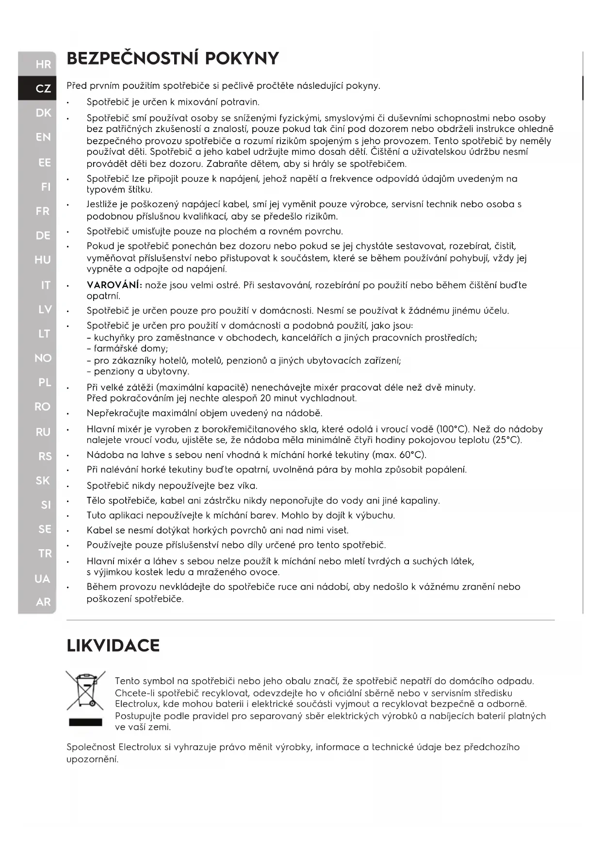 Spotřebič je určen k mixování potravin. Spotřebič smí používat osoby se sníženými fyzickými, smyslovými či duševními schopnostmi nebo osoby bez patřičných zkušeností a znalostí, pouze pokud tak činí pod dozorem nebo obdrželi instrukce ohledně bezpečného provozu spotřebiče a rozumí rizikům spojeným s jeho provozem. Tento spotřebič by neměly používat děti. Spotřebič a jeho kabel udržujte mimo dosah dětí. Čištění a uživatelskou údržbu nesmí provádět děti bez dozoru. Zabraňte dětem, aby si hrály se spotřebičem. Spotřebič lze připojit pouze k napájení, jehož napětí a frekvence odpovídá údajům uvedeným na typovém štítku. Jestliže je poškozený napájecí kabel, smí jej vyměnit pouze výrobce, servisní technik nebo osoba s podobnou příslušnou kvalifikací, aby se předešlo rizikům. Spotřebič umisťujte pouze na plochém a rovném povrchu. Pokud je spotřebič ponechán bez dozoru nebo pokud se jej chystáte sestavovat, rozebírat, čistit, vyměňovat příslušenství nebo přistupovat k součástem, které se během používání pohybují, vždy jej vypněte a odpojte od napájení. VAROVÁNÍ: nože jsou velmi ostré. Při sestavování, rozebírání po použití nebo během čištění buďte opatrní. Spotřebič je určen pouze pro použití v domácnosti. Nesmí se používat k žádnému jinému účelu. Spotřebič je určen pro použití v domácnosti a podobná použití, jako jsou: – kuchyňky pro zaměstnance v obchodech, kancelářích a jiných pracovních prostředích; – farmářské domy; – pro zákazníky hotelů, motelů, penzionů a jiných ubytovacích zařízení; – penziony a ubytovny. Při velké zátěži (maximální kapacitě) nenechávejte mixér pracovat déle než dvě minuty. Před pokračováním jej nechte alespoň 20 minut vychladnout. Nepřekračujte maximální objem uvedený na nádobě. Hlavní mixér je vyroben z borokřemičitanového skla, které odolá i vroucí vodě (100°C). Než do nádoby nalejete vroucí vodu, ujistěte se, že nádoba měla minimálně čtyři hodiny pokojovou teplotu (25°C). Nádoba na lahve s sebou není vhodná k míchání horké tekutiny (max. 60°C). Při nalévání horké tekutiny buďte opatrní, uvolněná pára by mohla způsobit popálení. Spotřebič nikdy nepoužívejte bez víka. Tělo spotřebiče, kabel ani zástrčku nikdy neponořujte do vody ani jiné kapaliny. Tuto aplikaci nepoužívejte k míchání barev. Mohlo by dojít k výbuchu. Kabel se nesmí dotýkat horkých povrchů ani nad nimi viset. Používejte pouze příslušenství nebo díly určené pro tento spotřebič. Hlavní mixér a láhev s sebou nelze použít k míchání nebo mletí tvrdých a suchých látek, s výjimkou kostek ledu a mraženého ovoce. Během provozu nevkládejte do spotřebiče ruce ani nádobí, aby nedošlo k vážnému zranění nebo poškození spotřebiče.HR